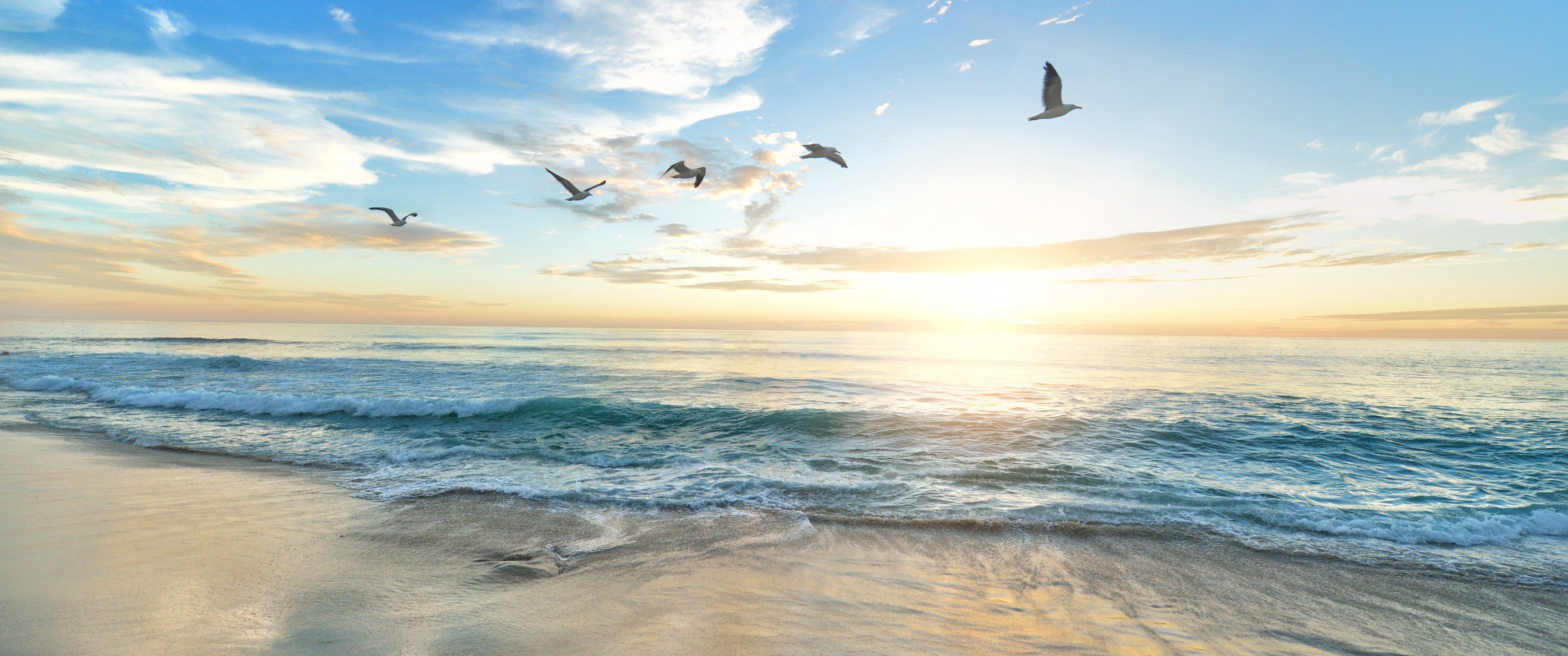 Обои: рассвет, море, пляж - 3440x1440