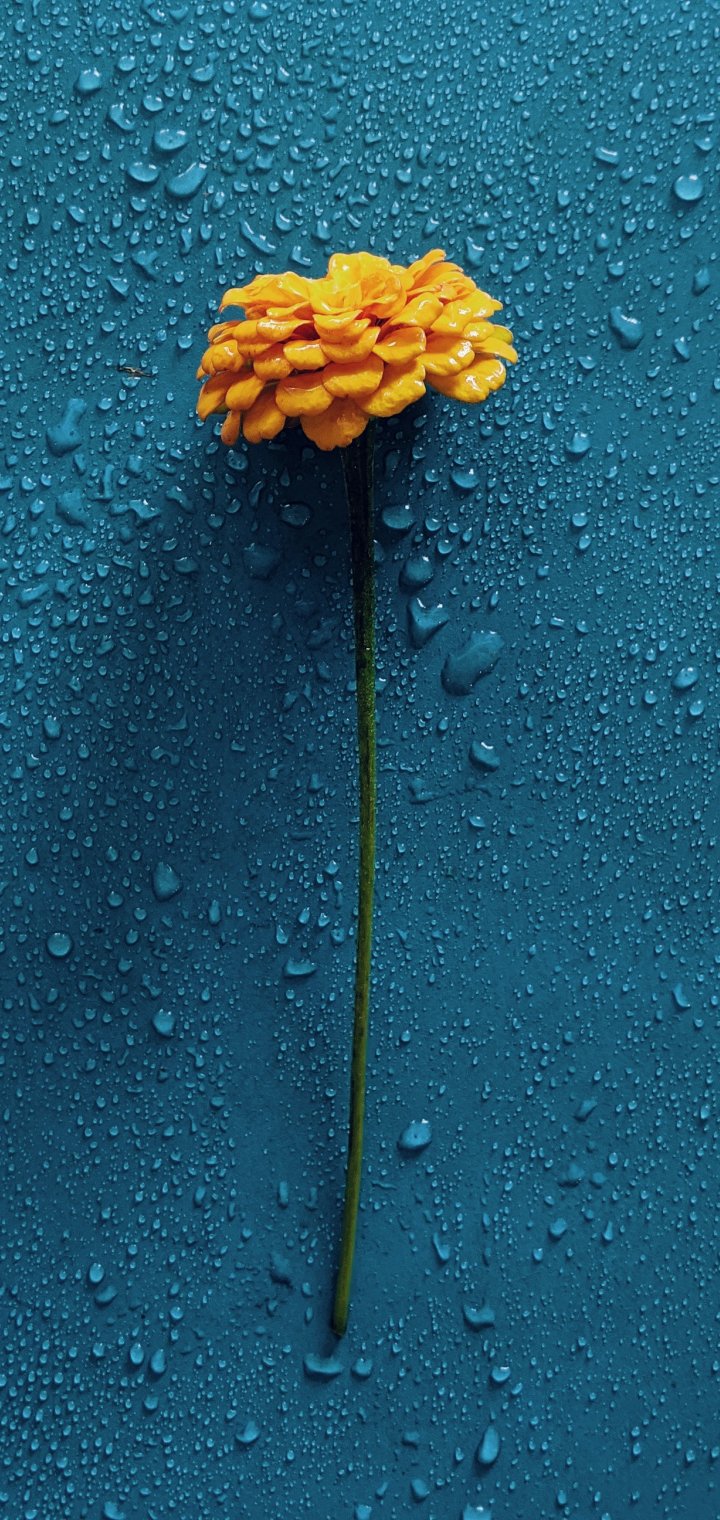 Обои: желтый цветок, синий, капли - 720x1520