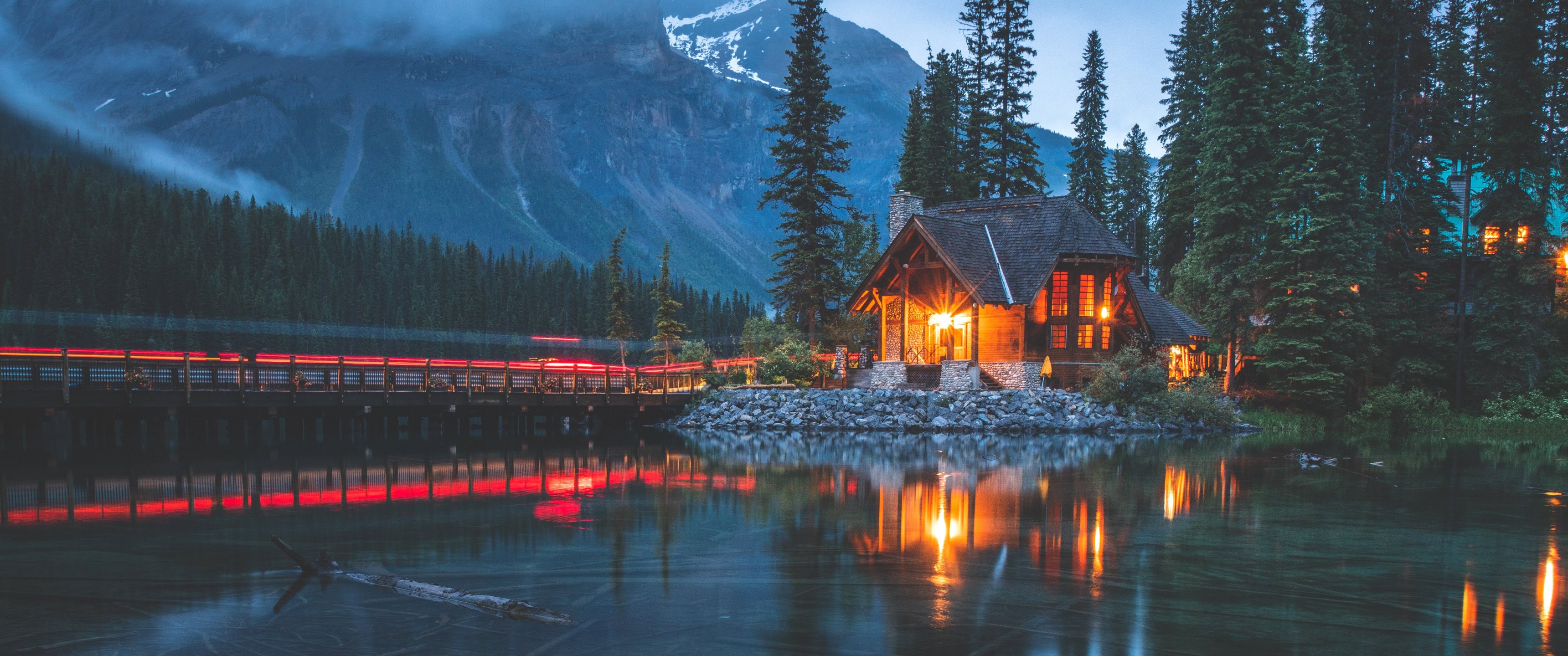 Обои: дом у озера, озеро, ночь - 3440x1440