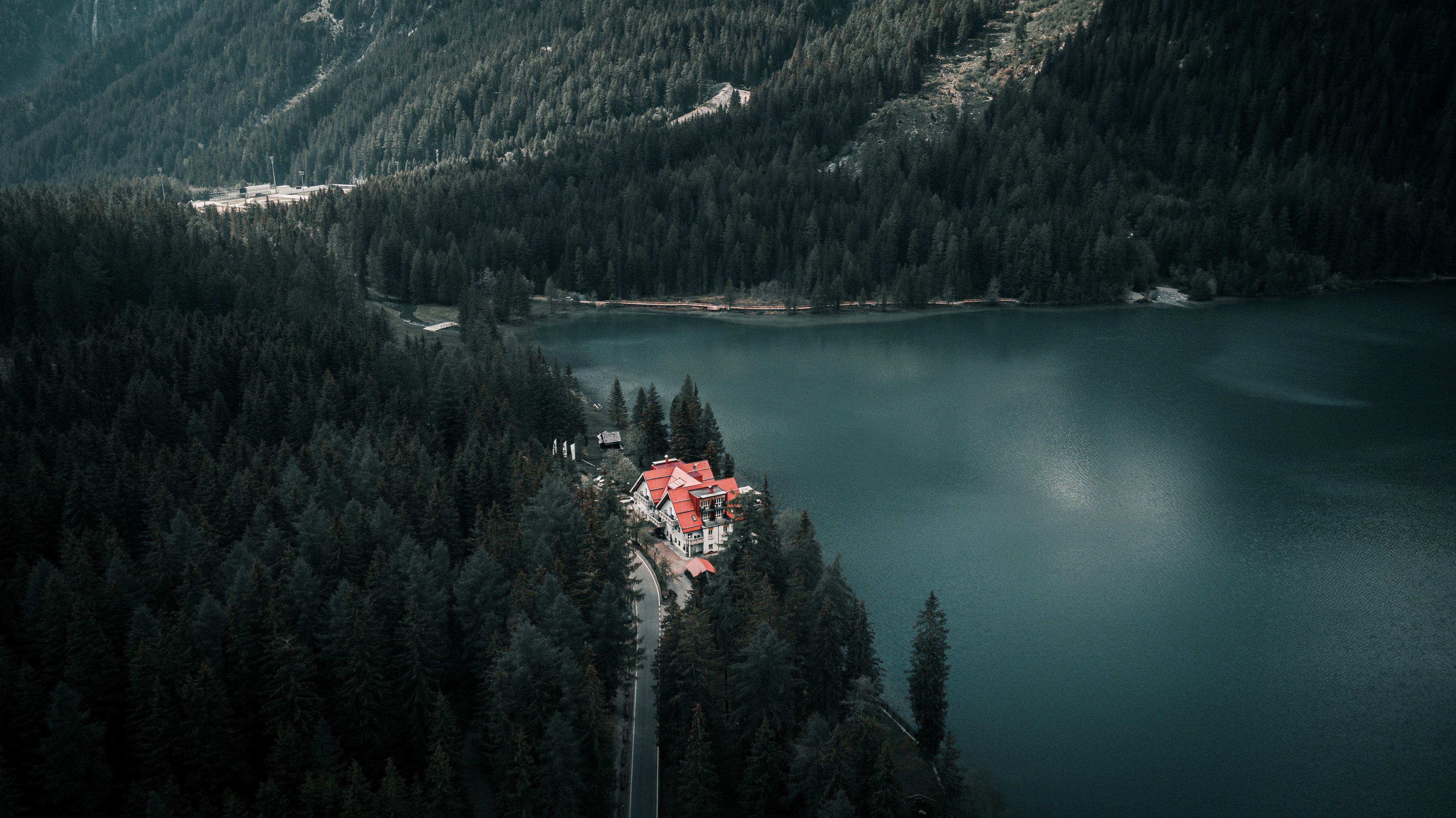 Обои: дом у озера, вид с высоты птичьего полета, зеленый - 3992x2242