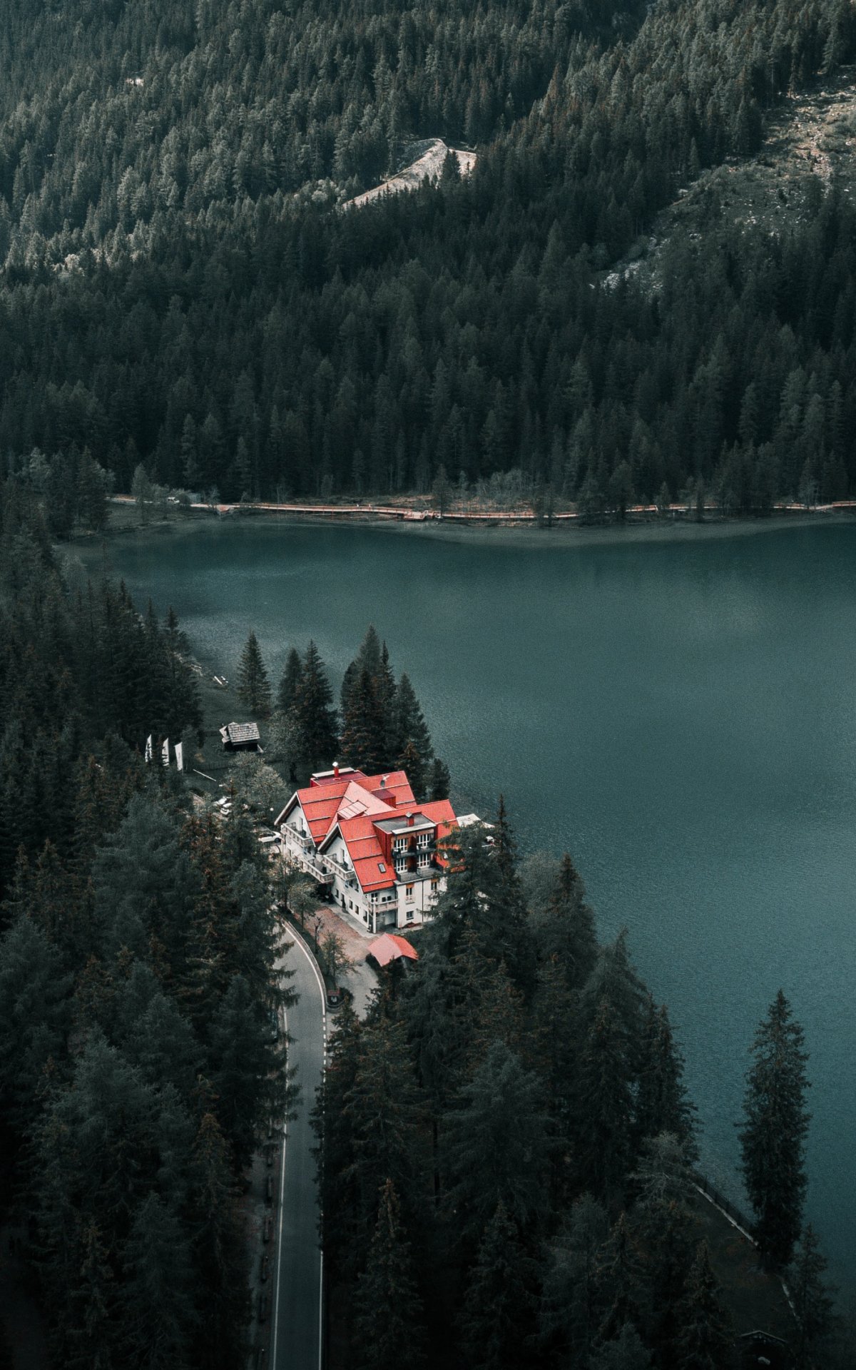 Обои: дом у озера, вид с высоты птичьего полета, зеленый - 1200x1920