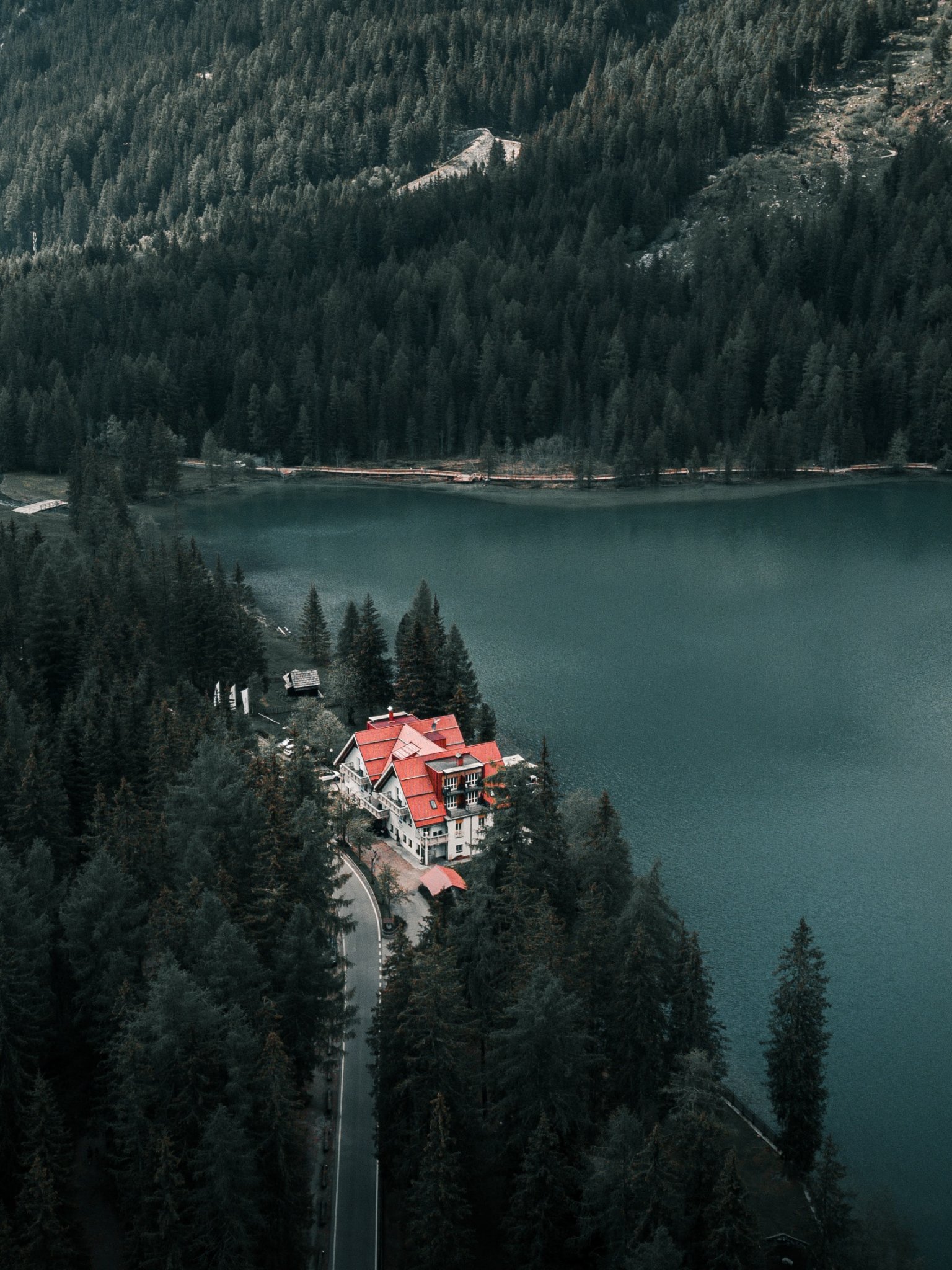 Обои: дом у озера, вид с высоты птичьего полета, зеленый - 1536x2048