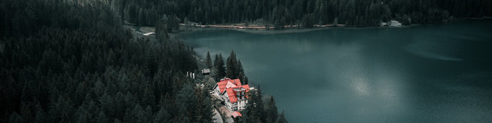 Обои: дом у озера, вид с высоты птичьего полета, зеленый - 1590x400