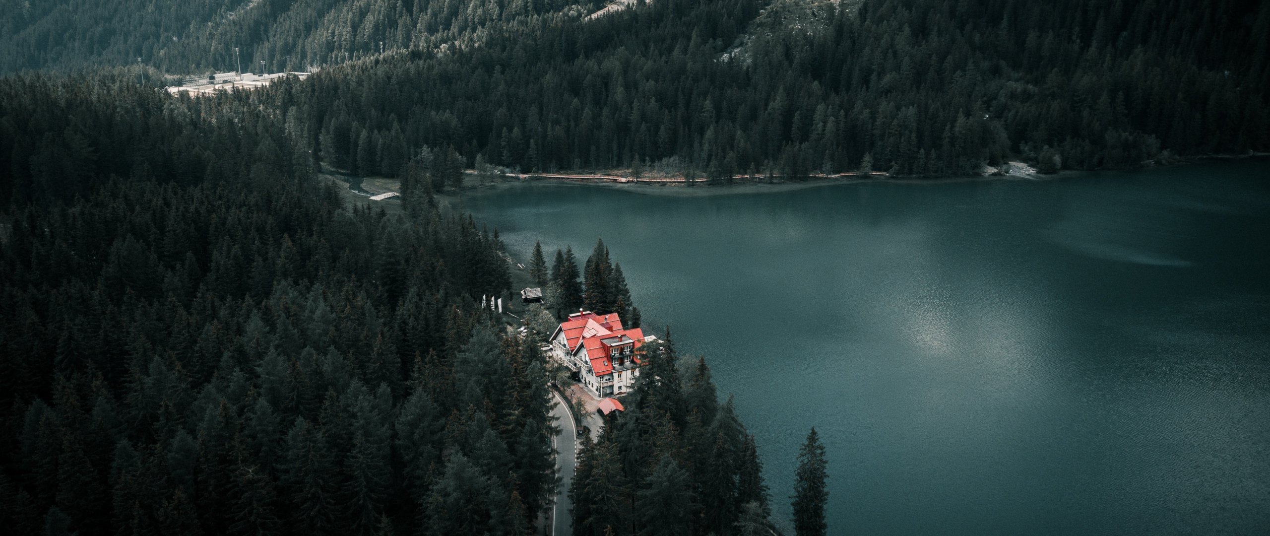 Обои: дом у озера, вид с высоты птичьего полета, зеленый - 2560x1080