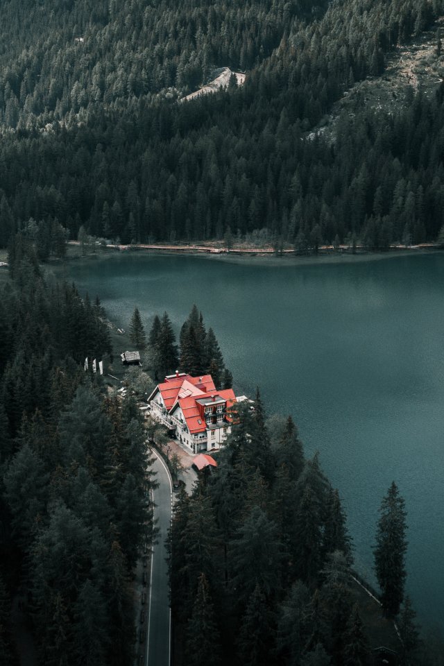 Обои: дом у озера, вид с высоты птичьего полета, зеленый - 640x960