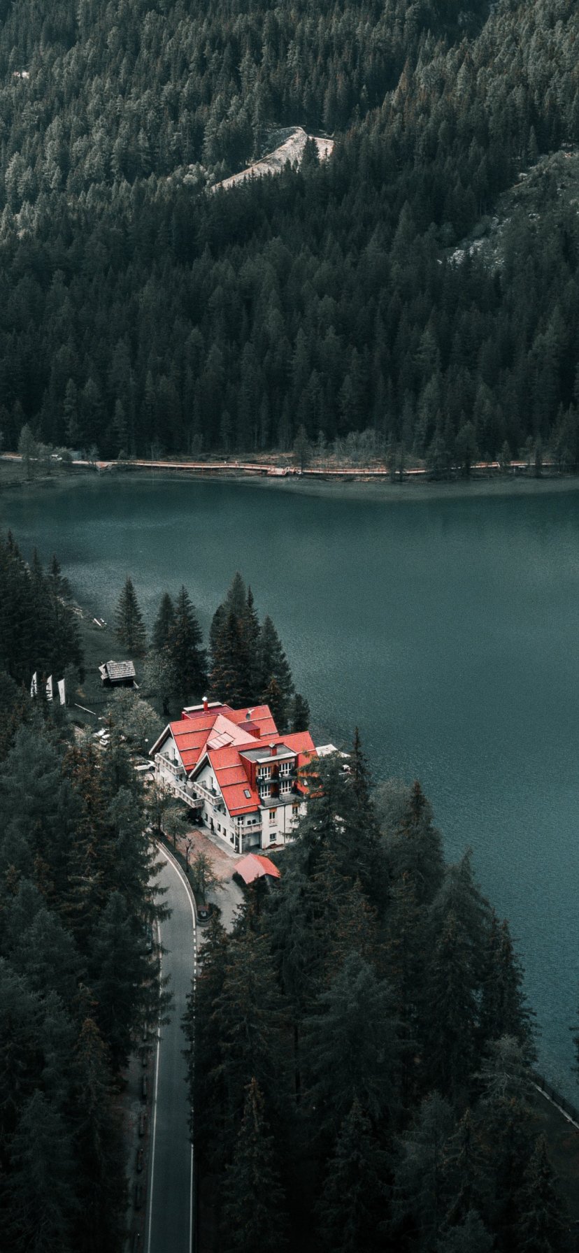 Обои: дом у озера, вид с высоты птичьего полета, зеленый - 828x1792