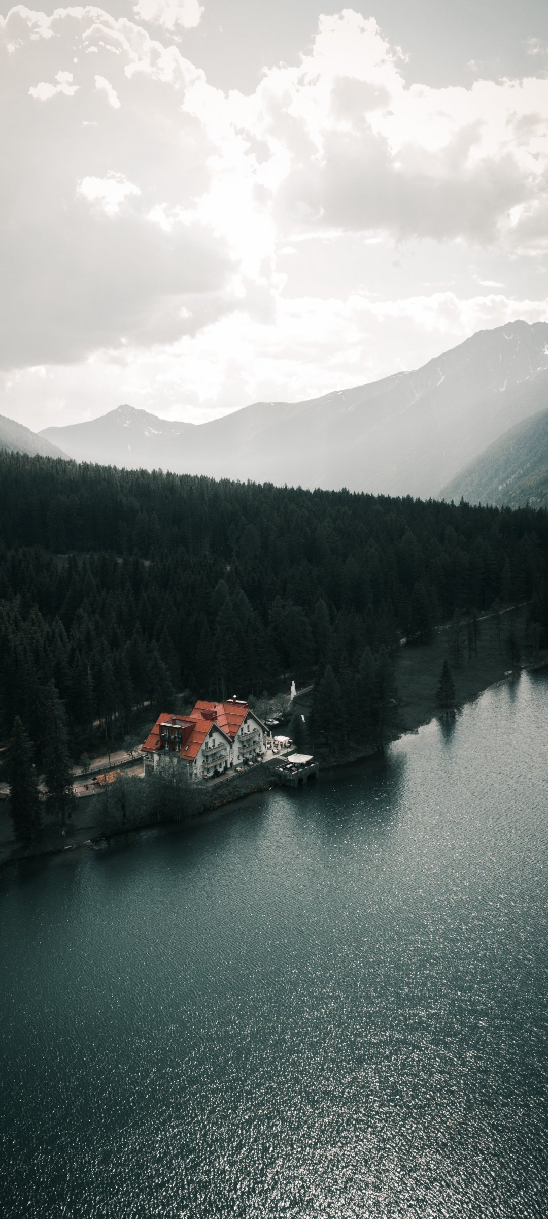 Обои: дом у озера, вид с высоты птичьего полета, зеленый - 1080x2400