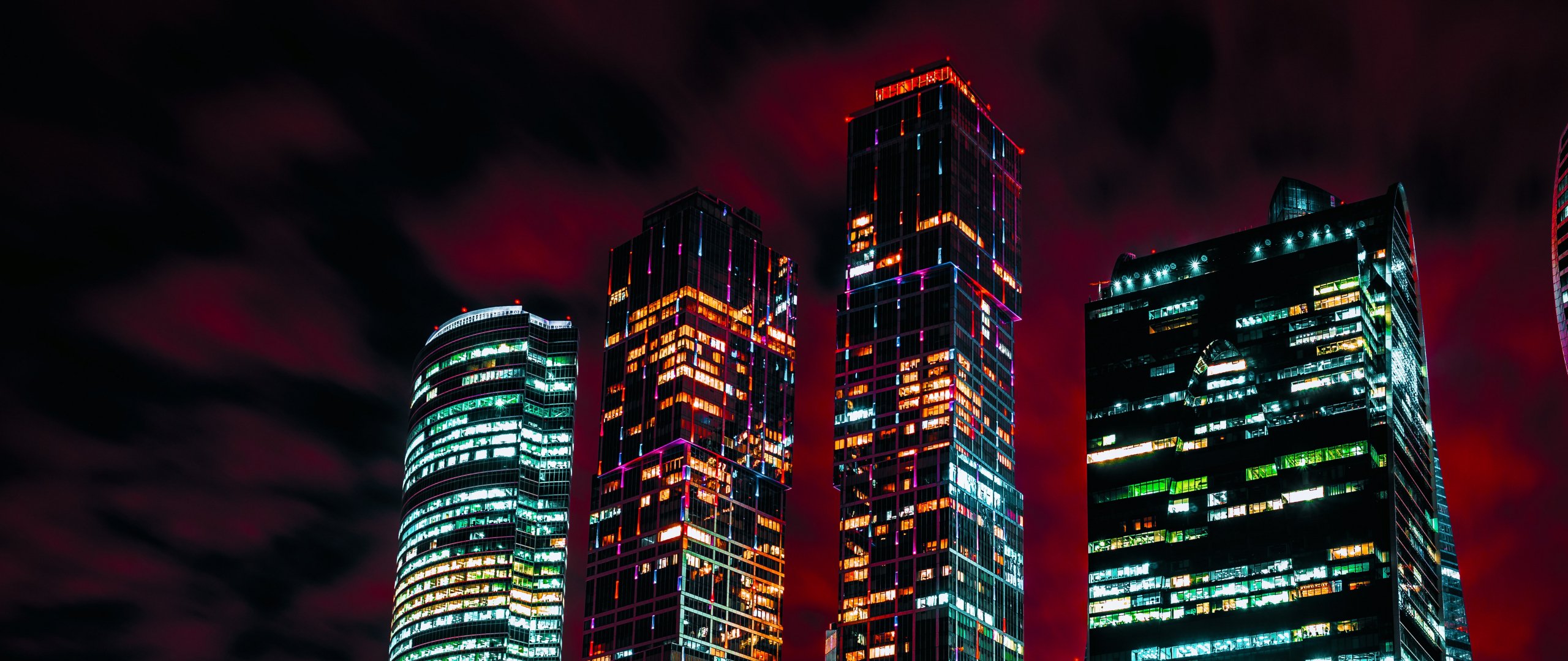 Обои: Москва-Сити, небоскребы, ночь - 2560x1080