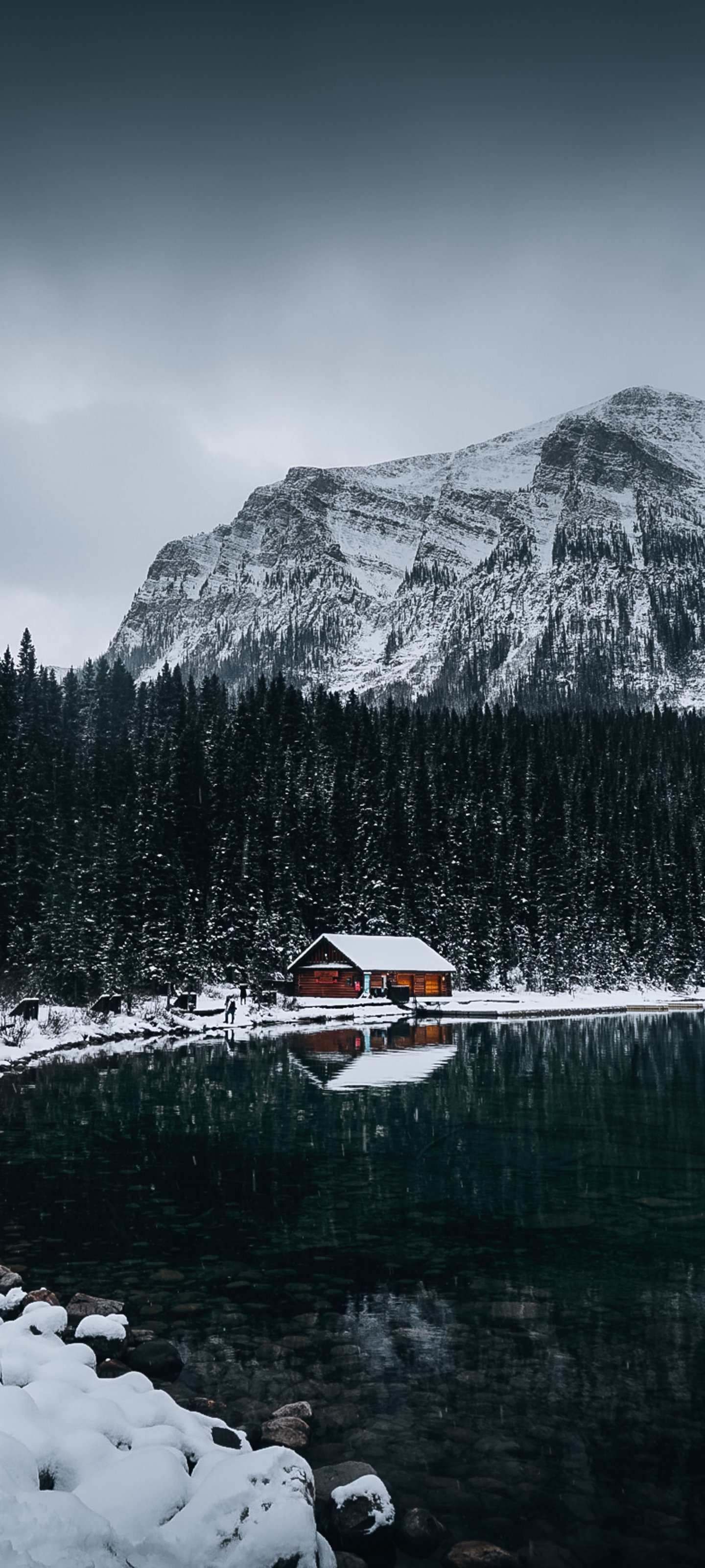 Обои: дом у озера, снег, зима - 1440x3200