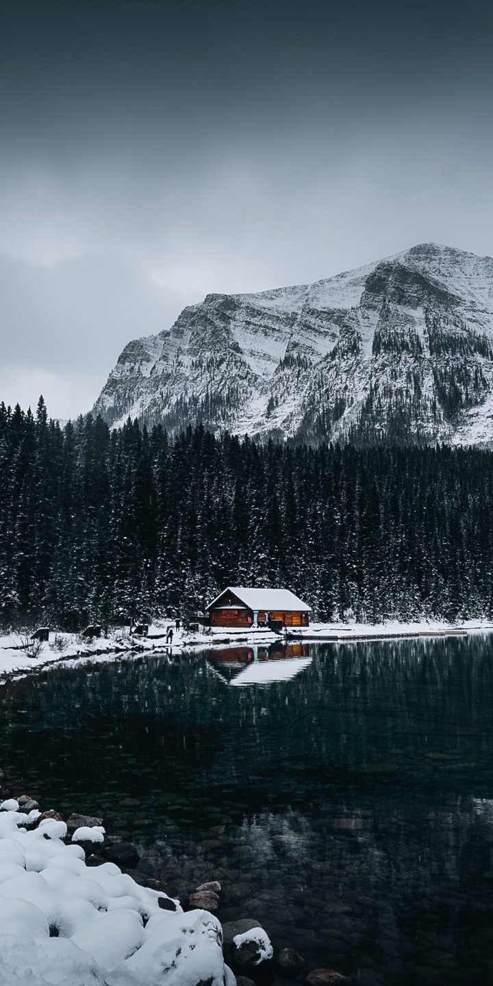 Обои: дом у озера, снег, зима - 720x1440