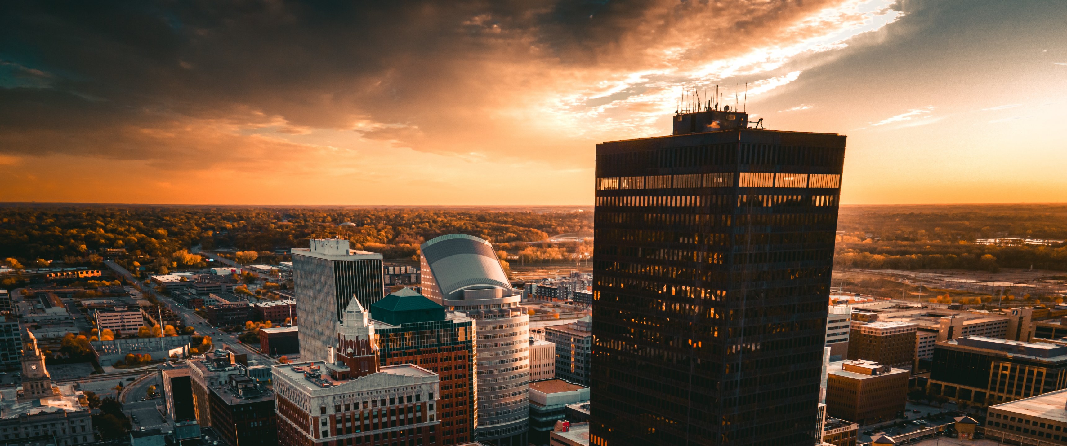 Обои: Де-Мойн, закат, вид с высоты птичьего полета - 3440x1440