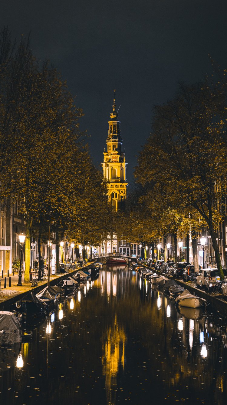 Обои: Амстердам, канал, ночной город - 750x1334