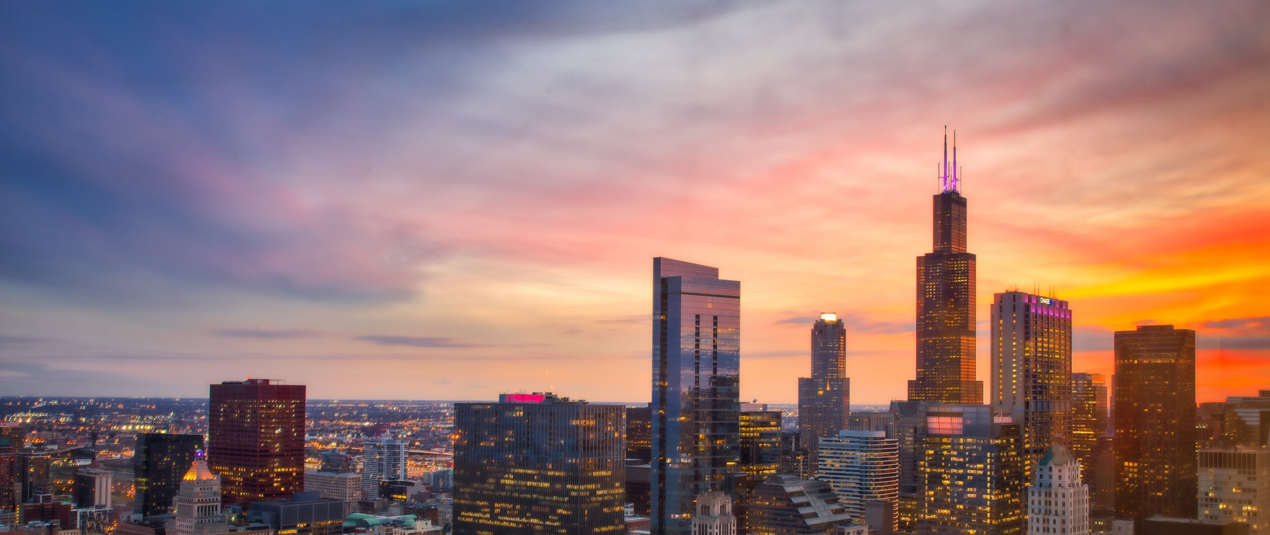Обои: Чикаго, вид с высоты птичьего полета, закат - 2560x1080