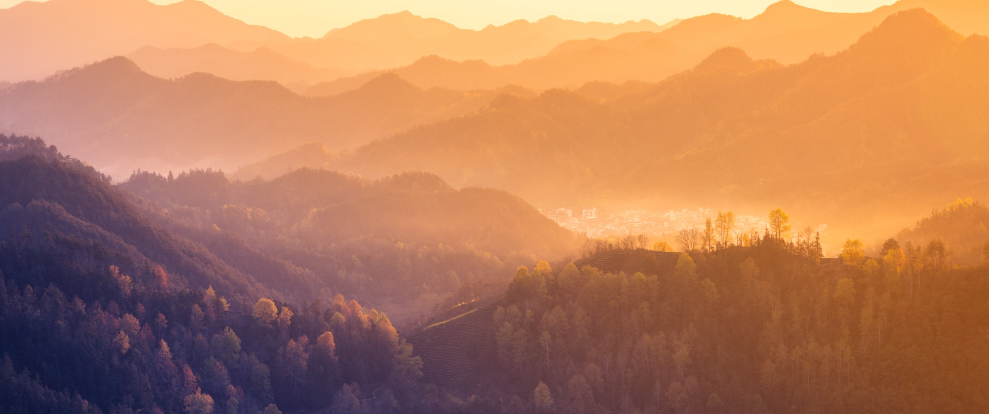Обои: вид с высоты птичьего полета, горный хребет, рассвет - 3440x1440