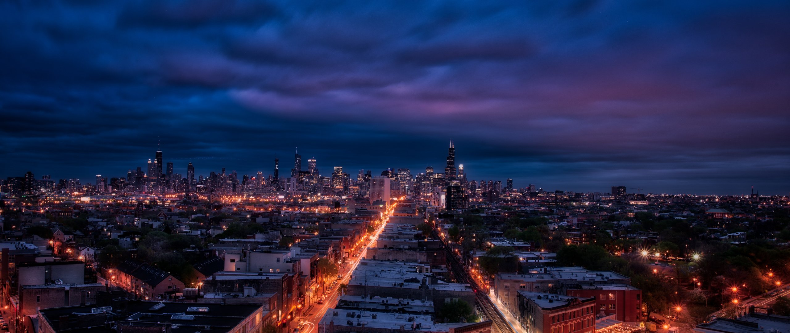 Обои: Чикаго, ночной город, мегаполис - 2560x1080