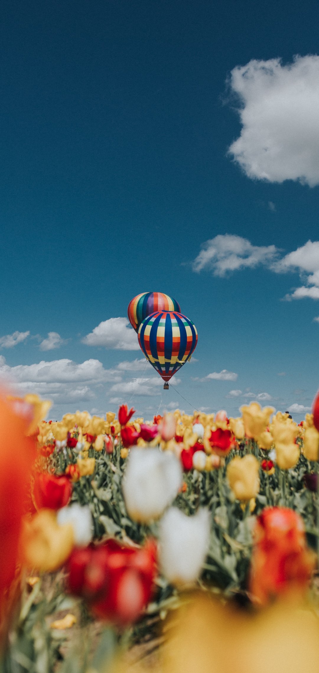 Обои: воздушный шар, тюльпаны, голубое небо - 1080x2280