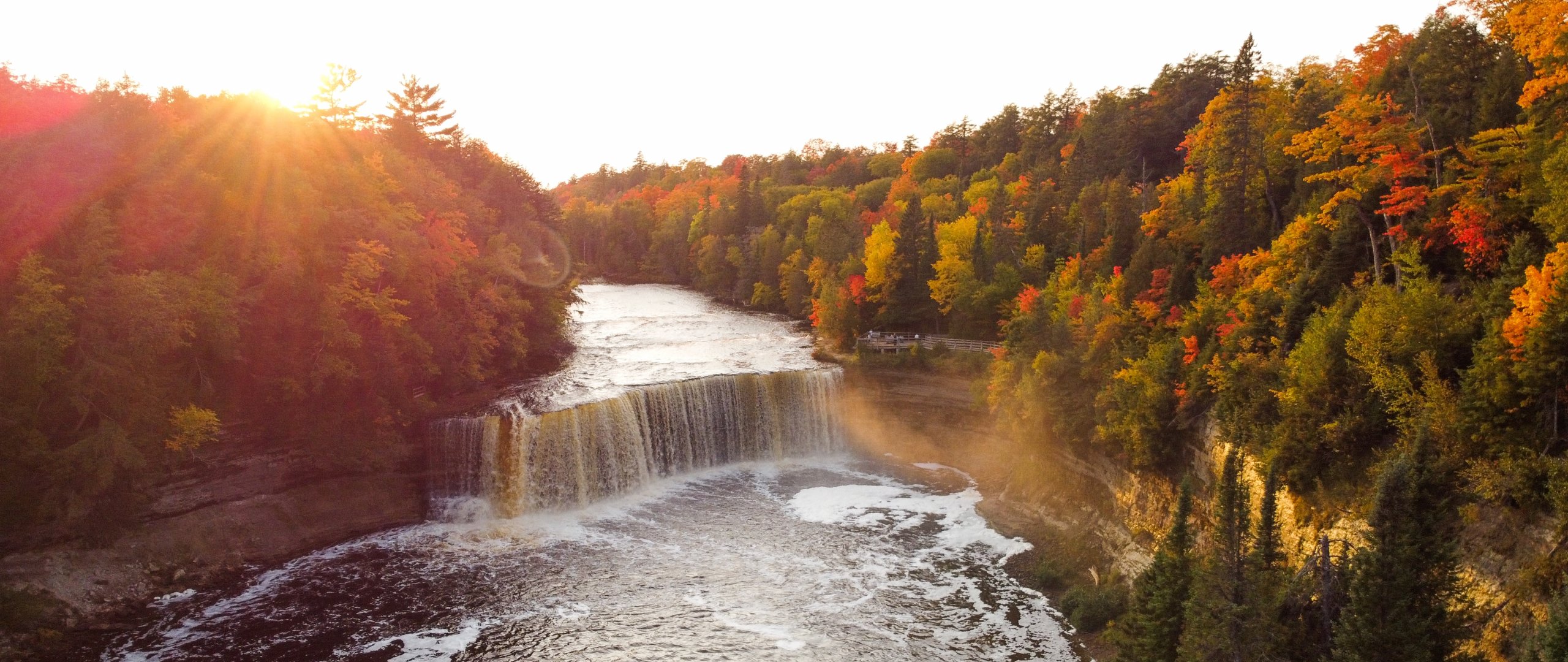 Обои: водопад, солнечный свет, вид с высоты птичьего полета - 2560x1080