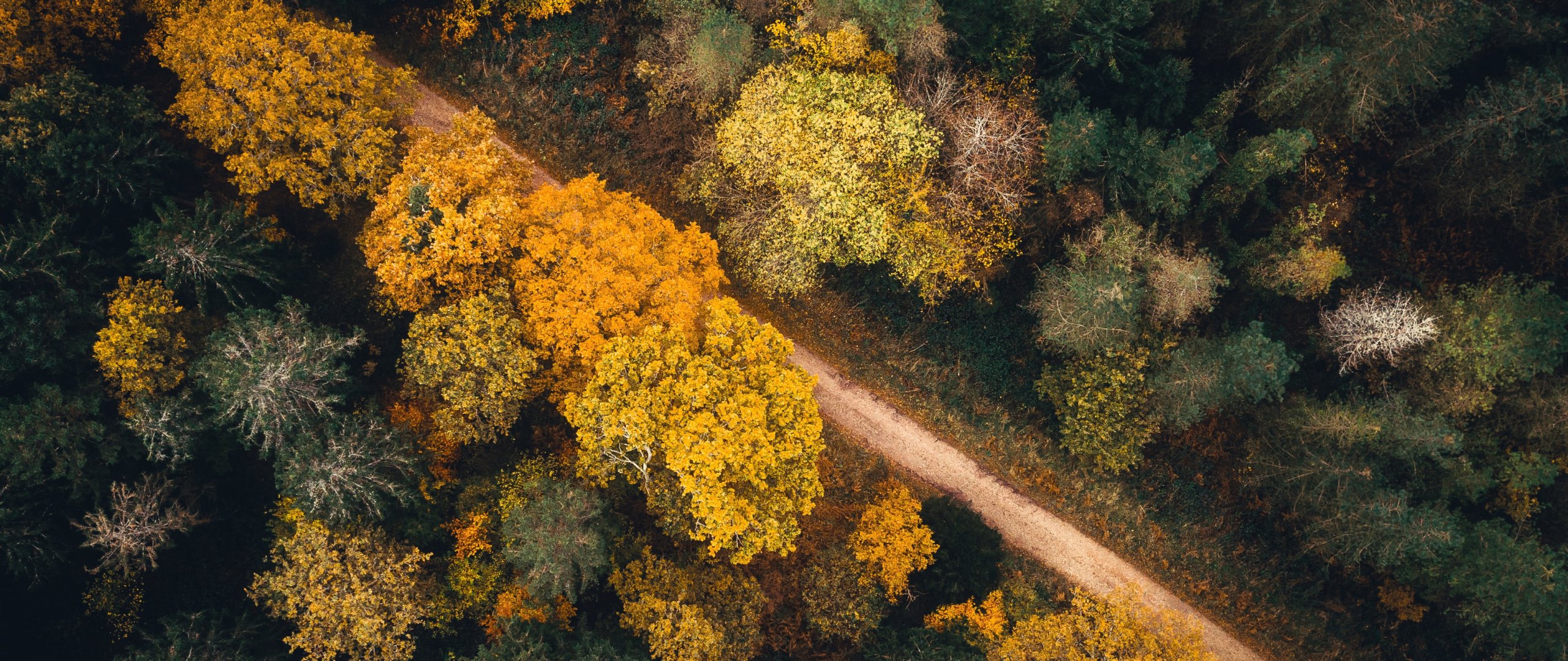 Обои: осенний лес, дорога - 2560x1080