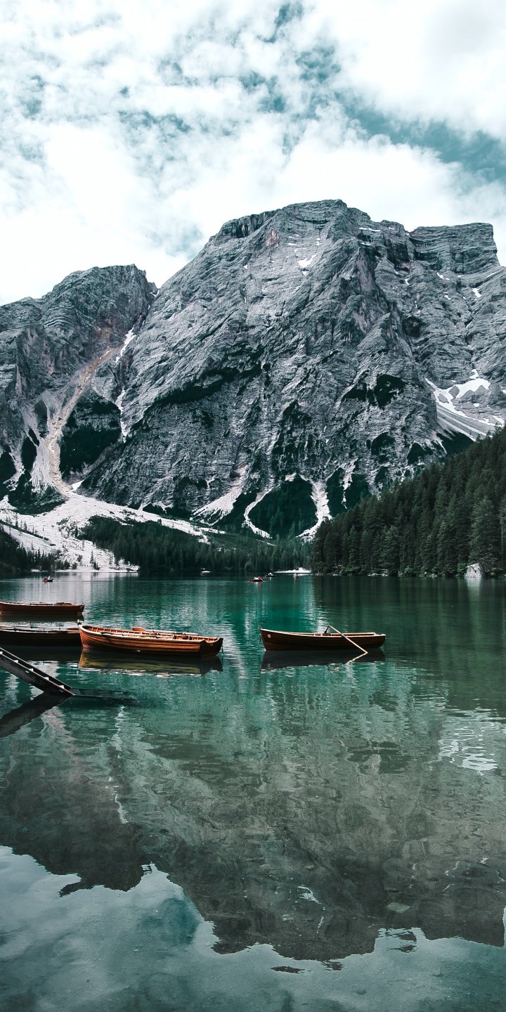 Обои: Озеро, лодки, горный пейзаж - 720x1440