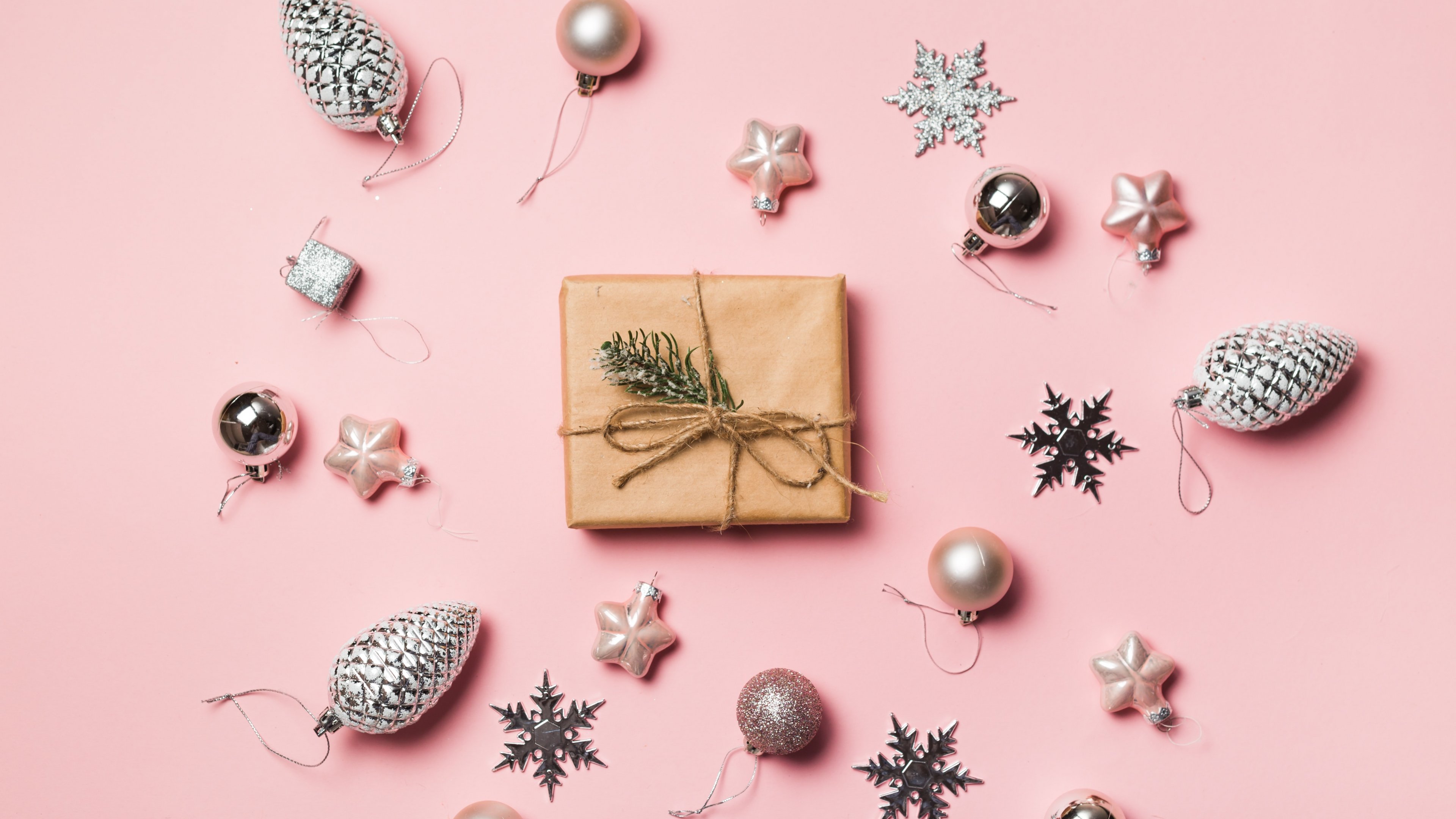 Обои: Подарки, Шарики, розовый фон - 3840x2160
