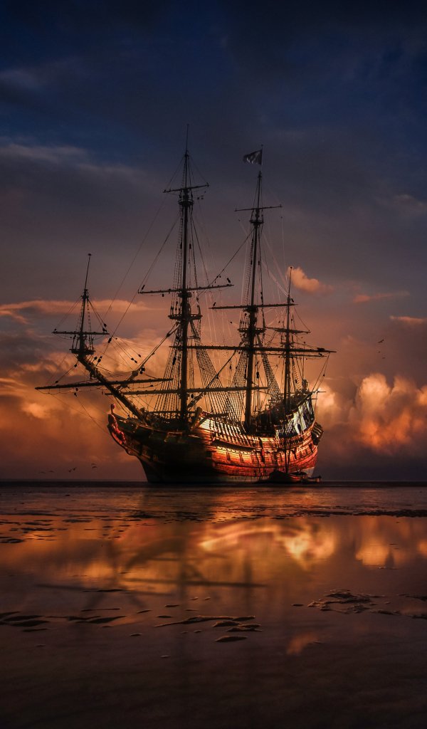 Обои: Корабль, море, закат - 600x1024