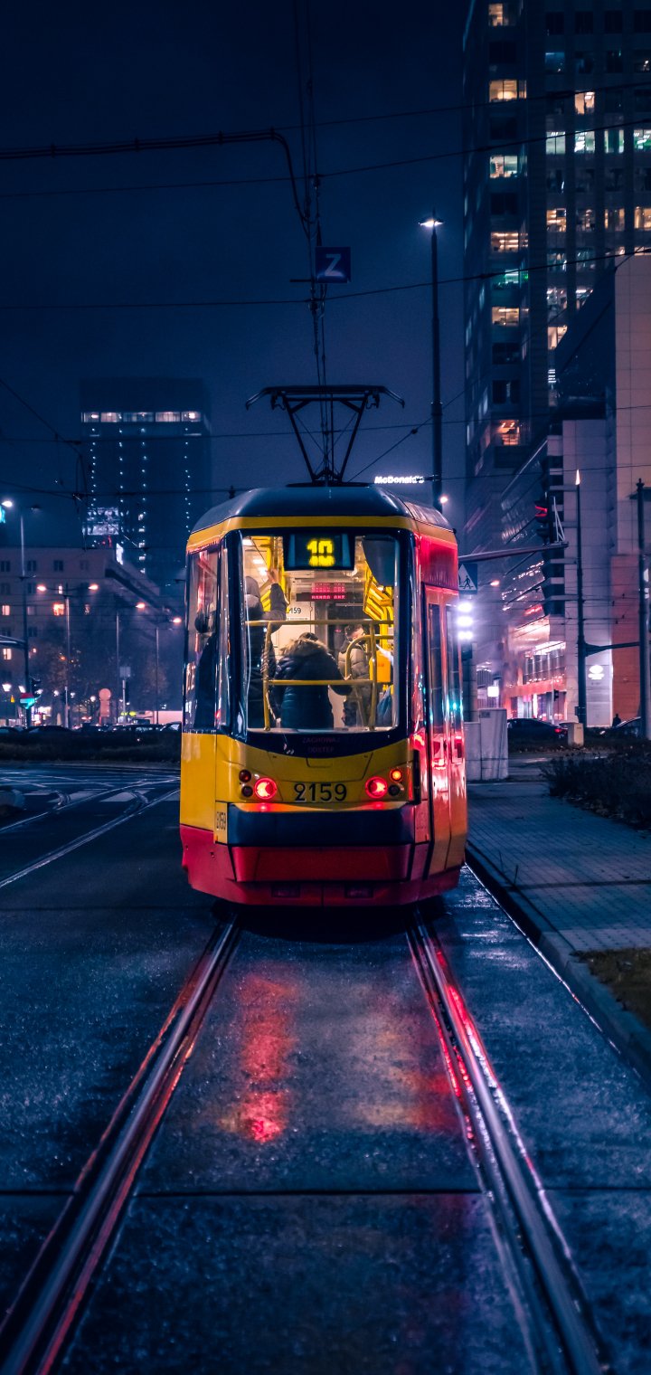 Обои: ночной город, трамвай - 720x1520
