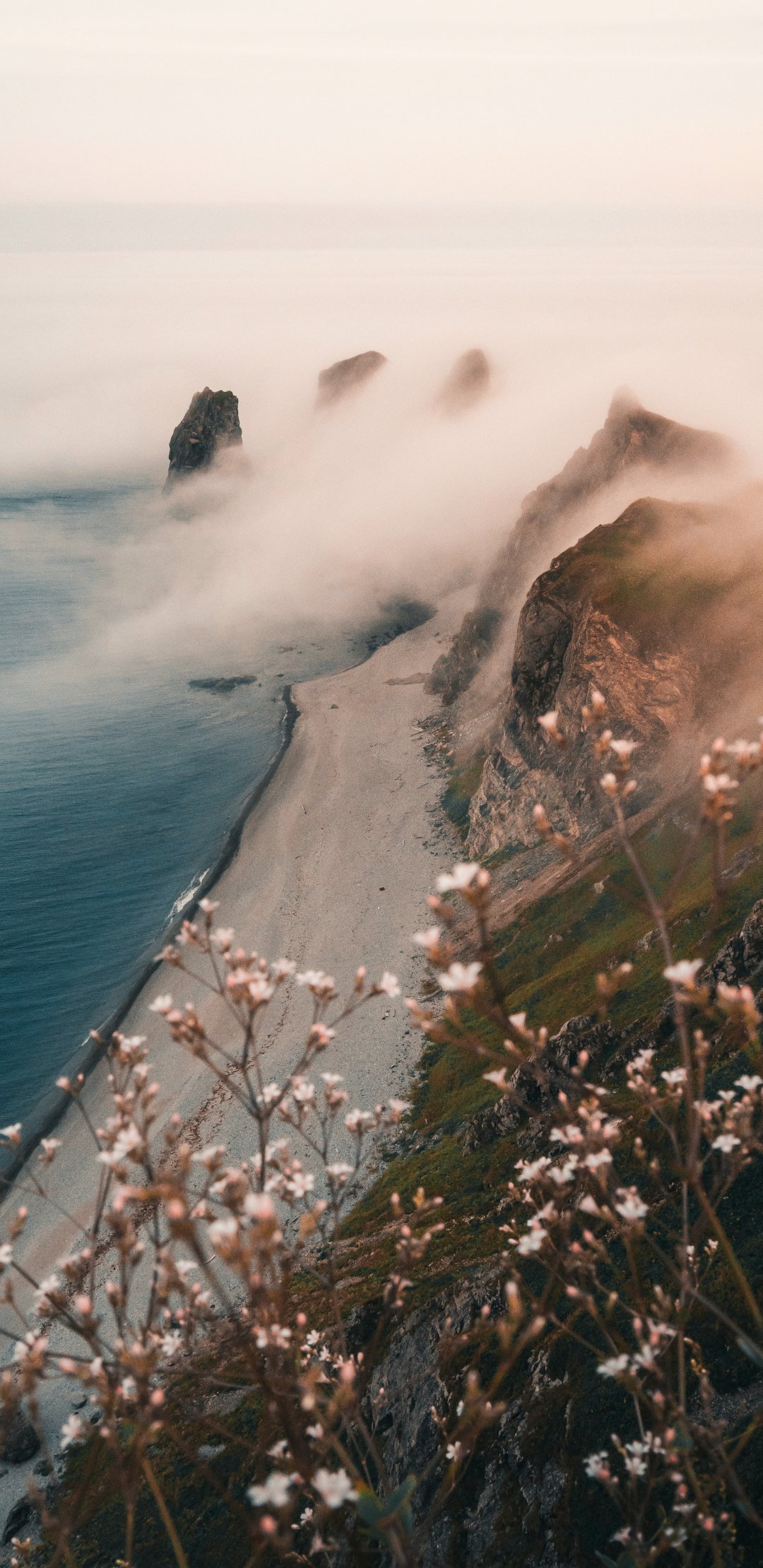 Обои: горы, море, туман - 1080x2220