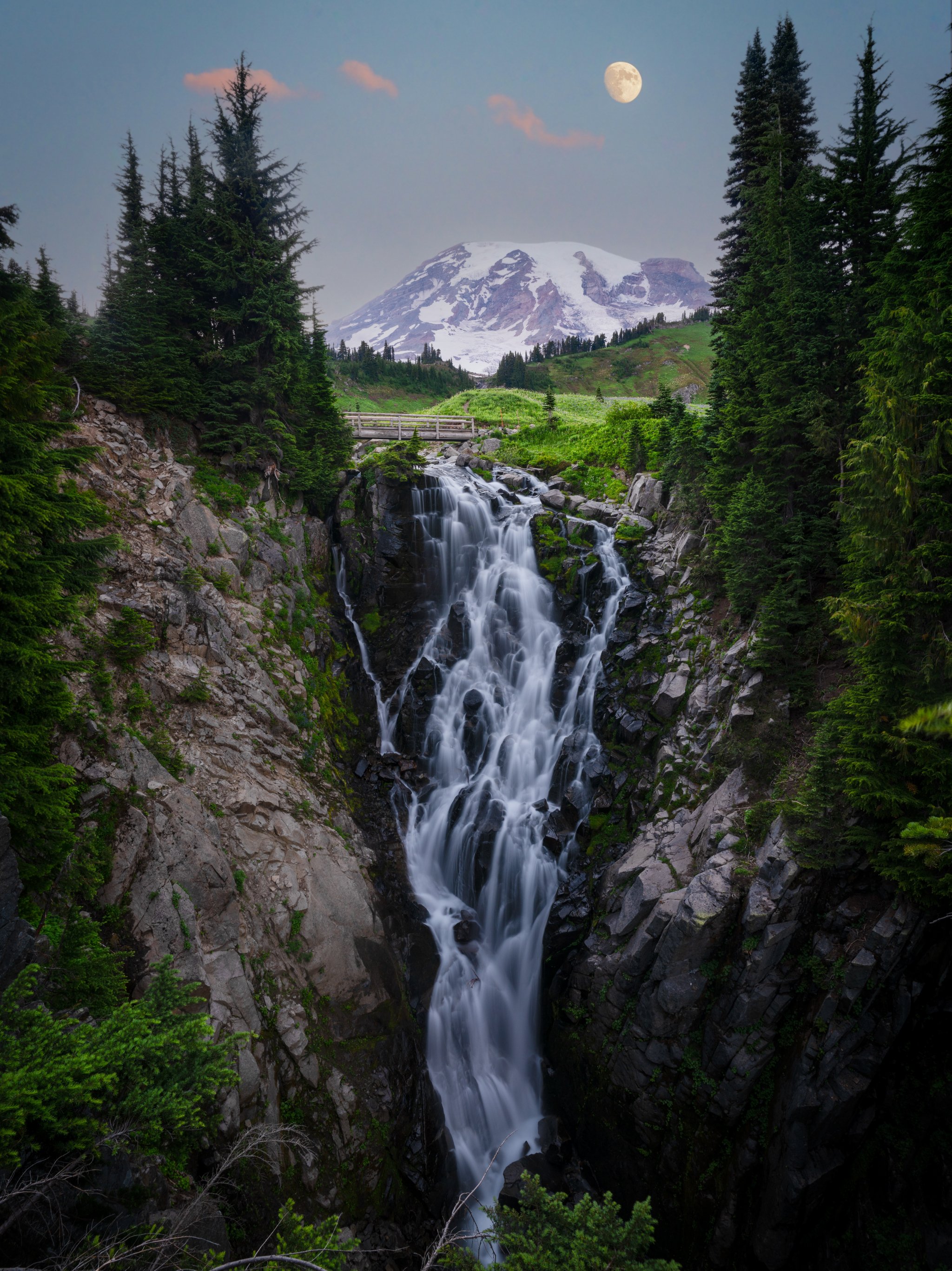 Обои: водопад, гора Рейнир, луна - 2048x2732