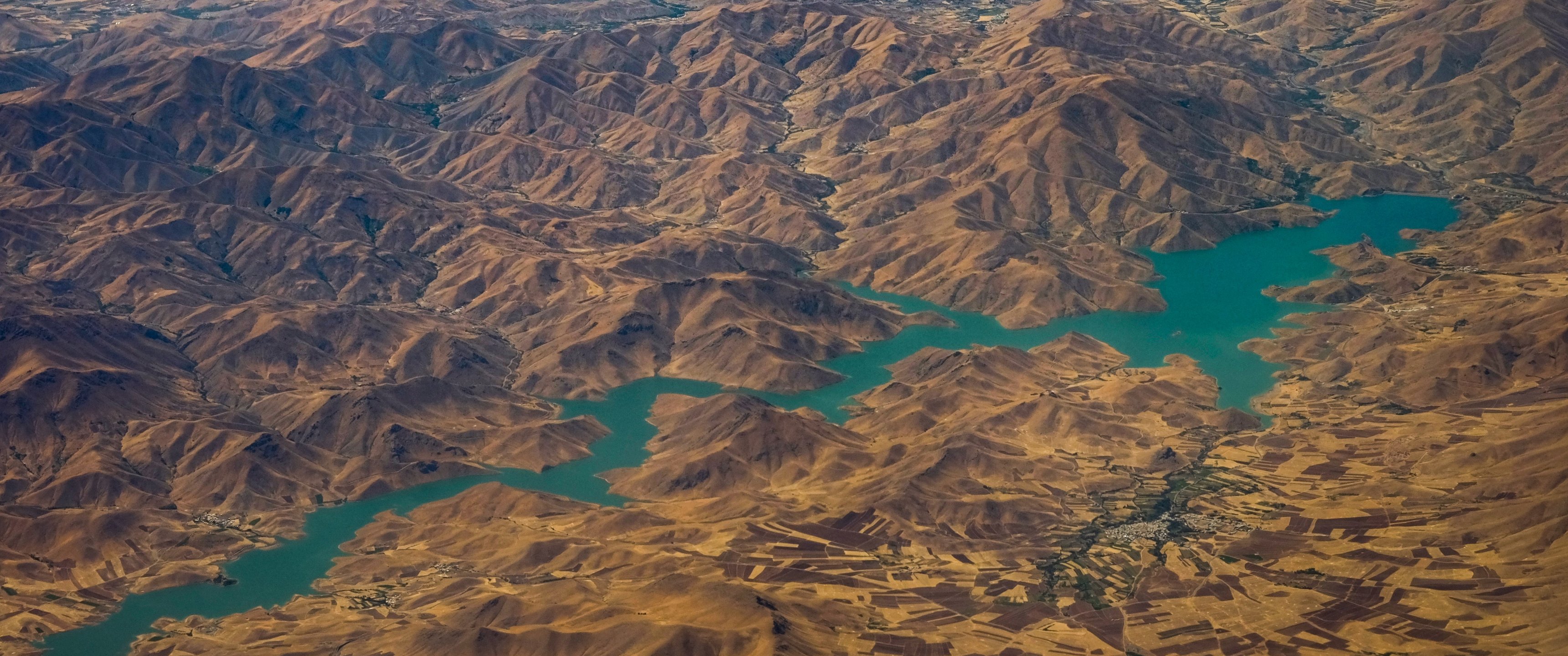 Обои: горы, река, с высоты птичьего полета - 3440x1440