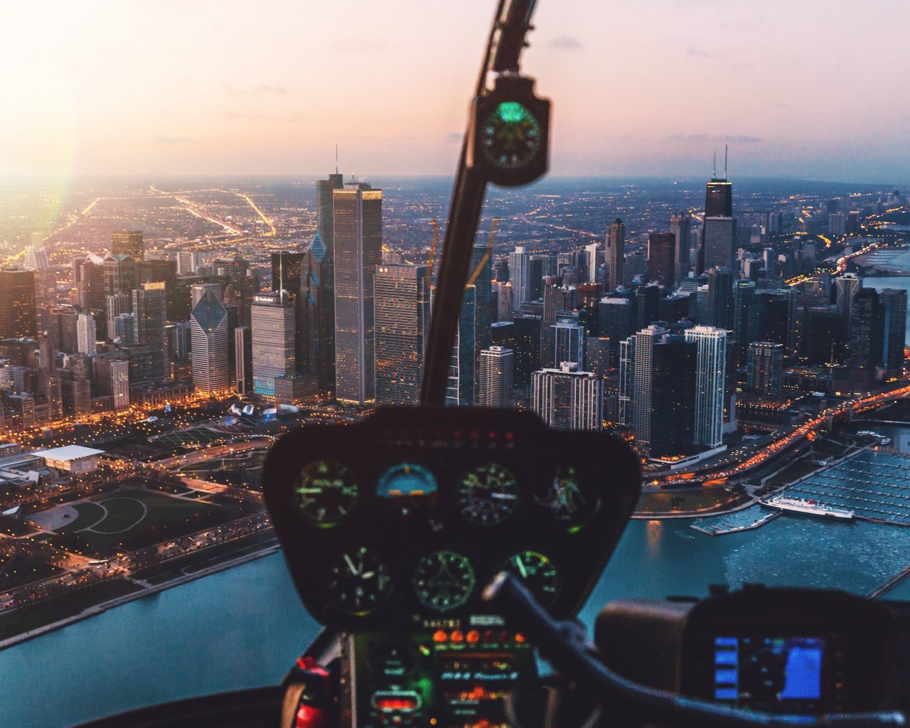 Обои: кабина вертолета, небоскребы, полет - 1280x1024