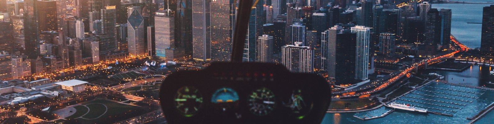 Обои: кабина вертолета, небоскребы, полет - 1590x400