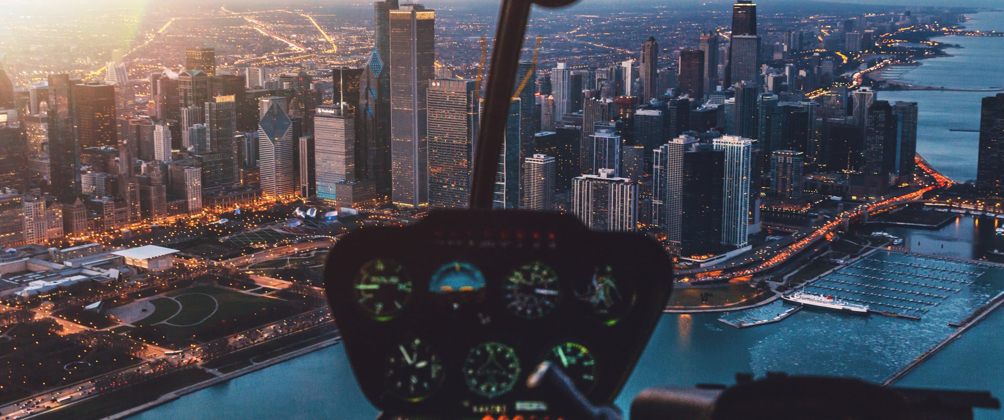 Обои: кабина вертолета, небоскребы, полет - 3440x1440
