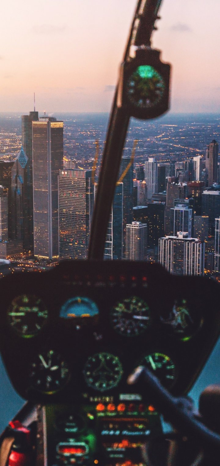 Обои: кабина вертолета, небоскребы, полет - 720x1520