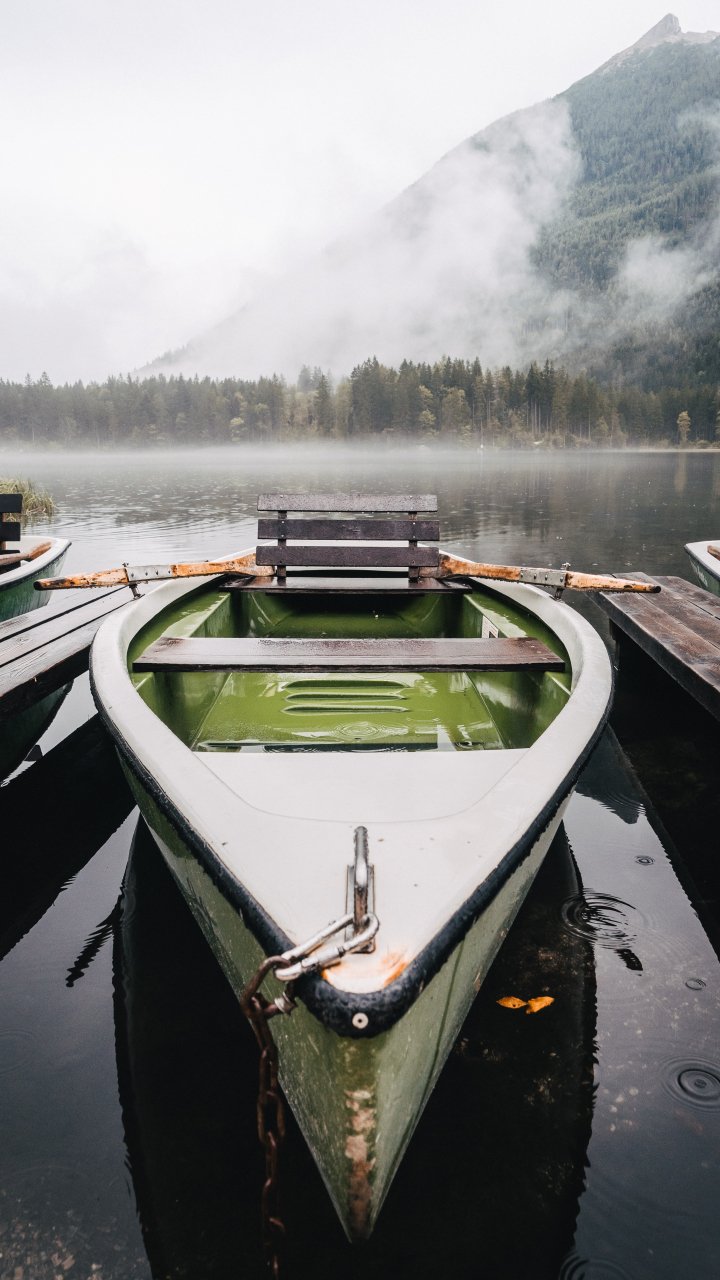 Обои: лодка, озеро, туман, горы - 720x1280