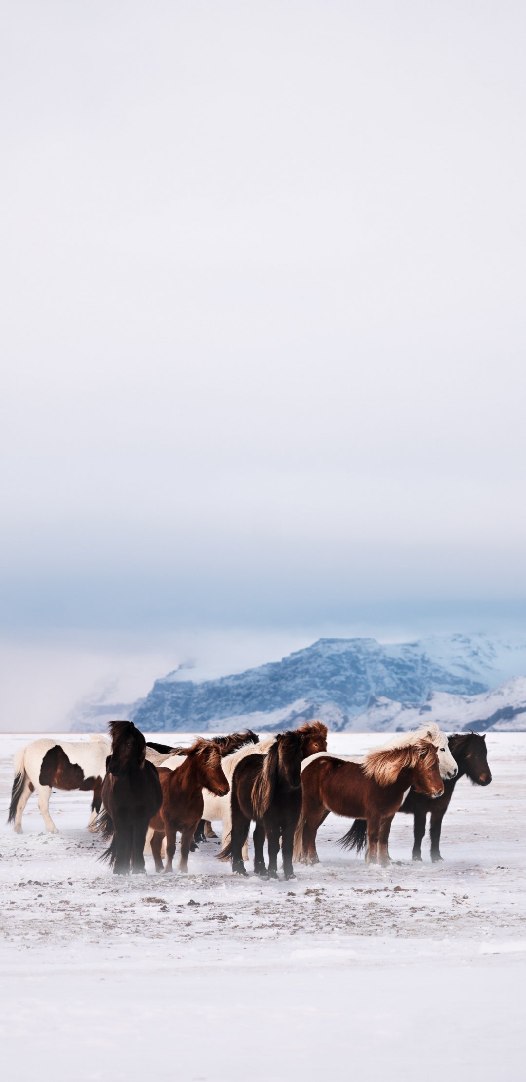 Обои: табун лошадей, снежная равнина - 1080x2220