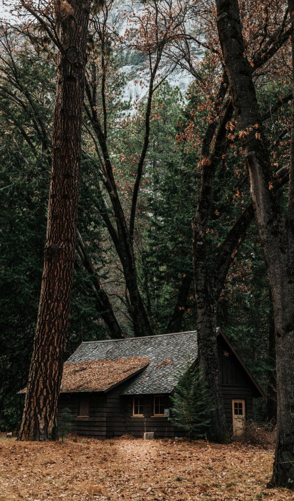 Обои: домик в лесу, хвойный лес - 600x1024