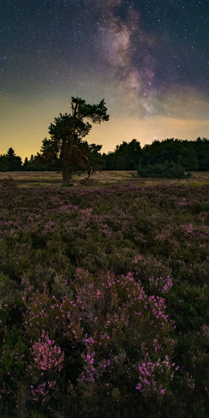 Обои: цветочное поле, звездное небо - 720x1440