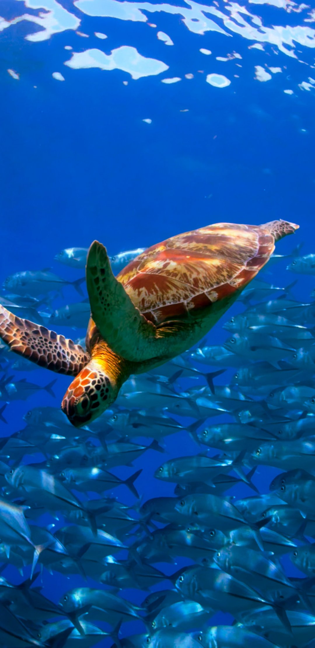 Обои: черепаха, косяк рыб - 1080x2220