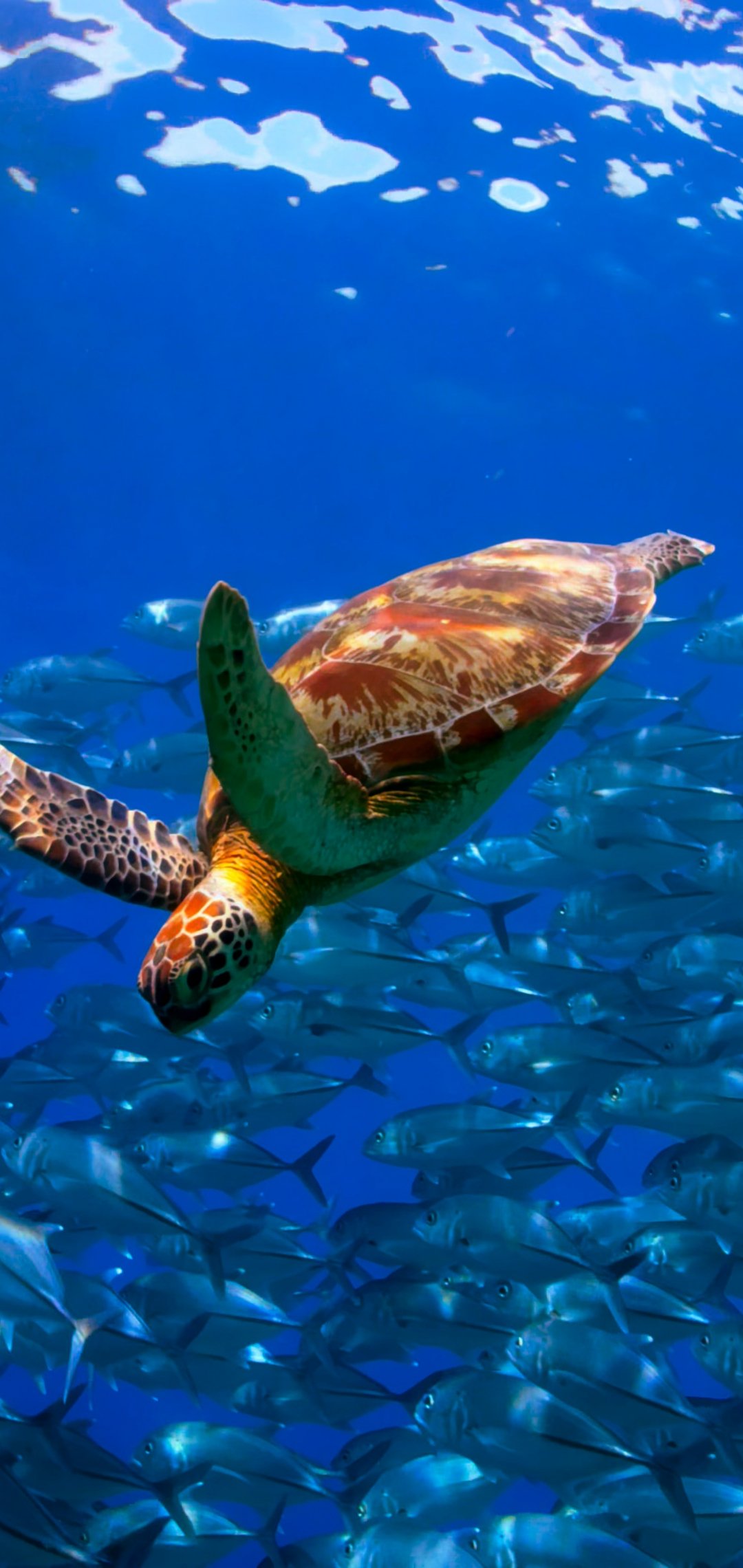 Обои: черепаха, косяк рыб - 1080x2280