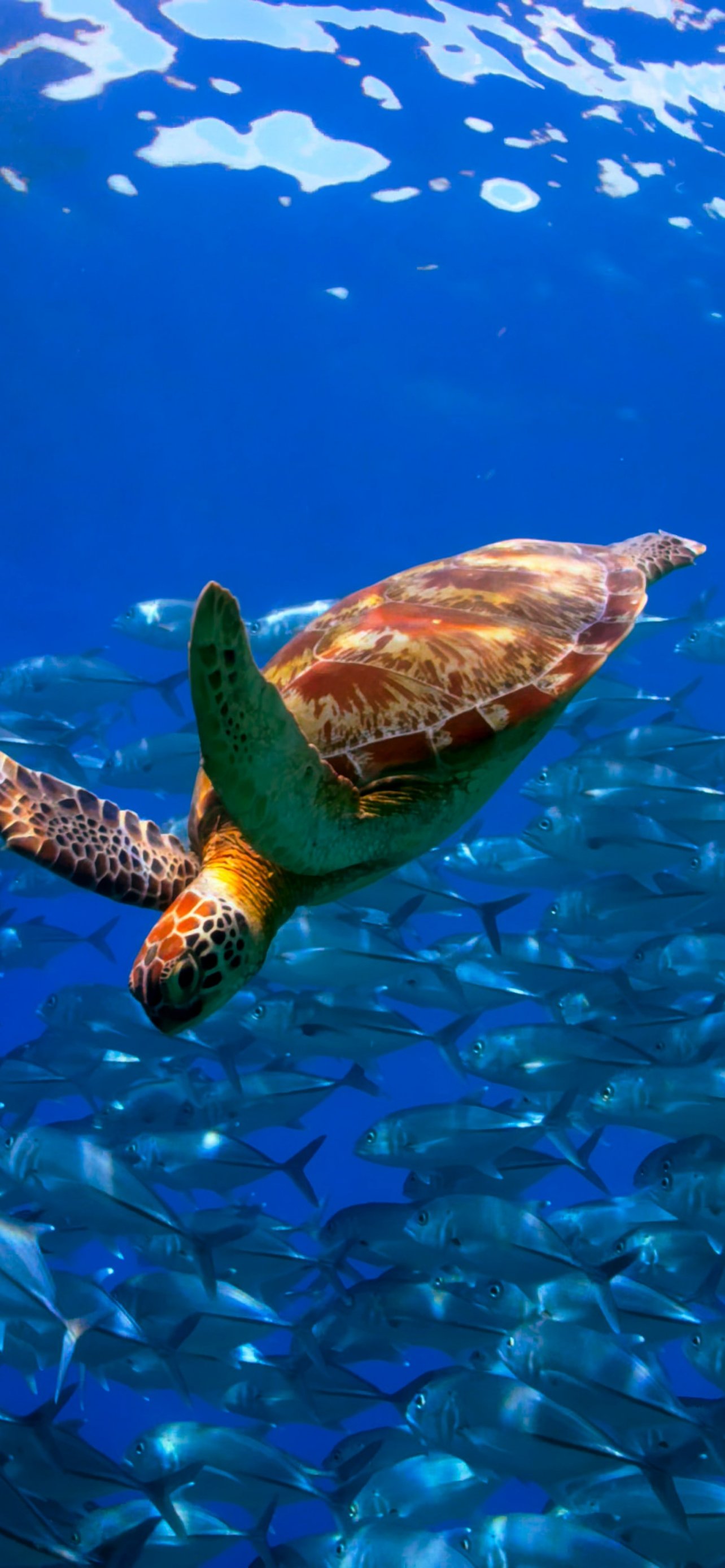 Обои: черепаха, косяк рыб - 1284x2778
