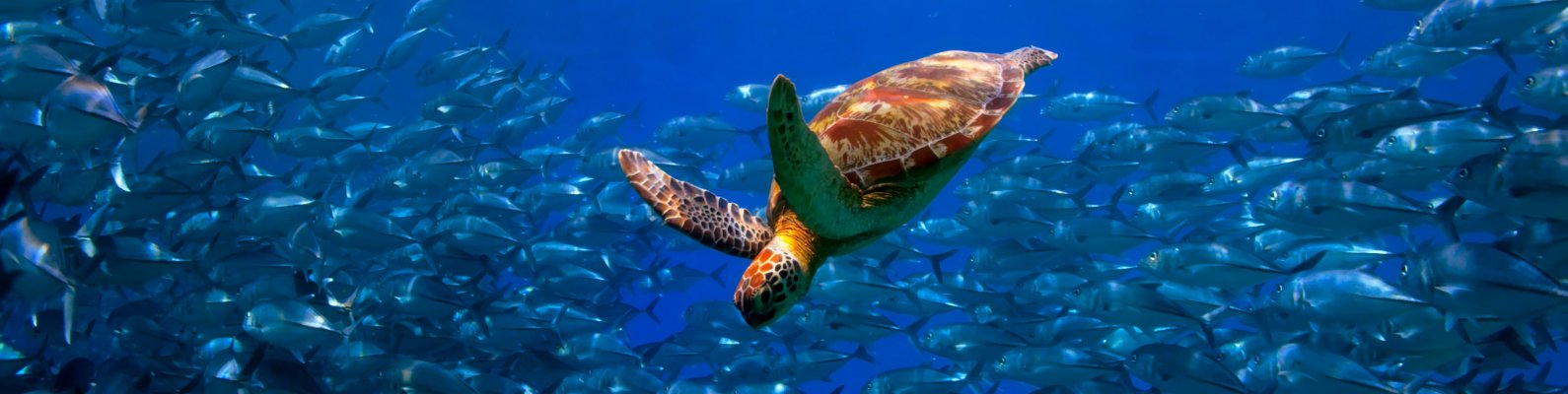 Обои: черепаха, косяк рыб - 1590x400