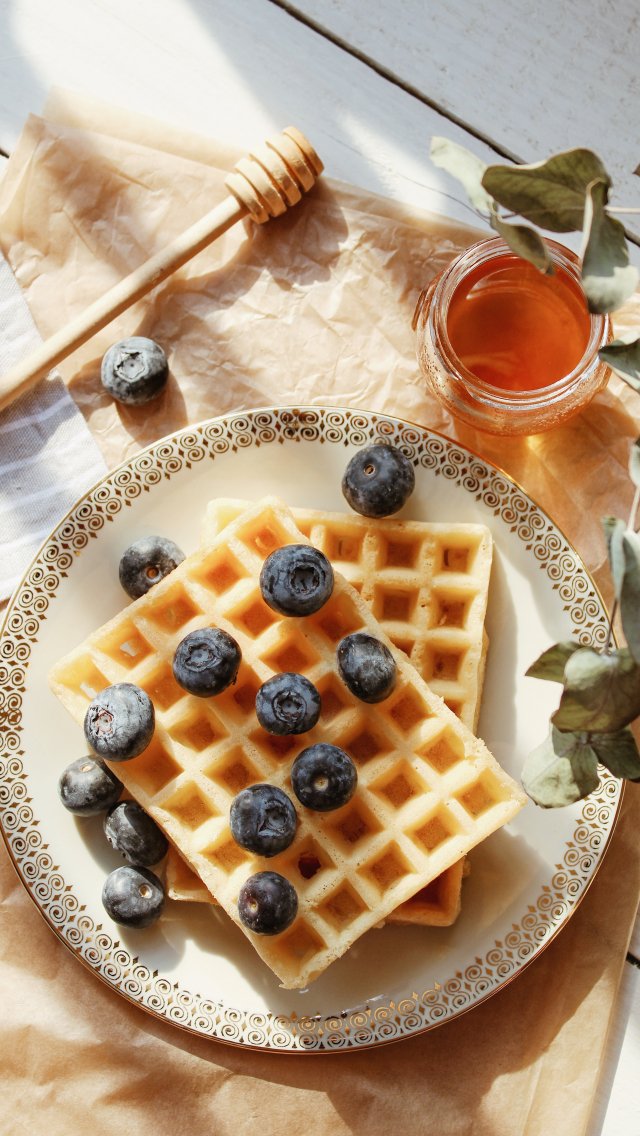 Обои: вафли, ягоды, мед - 640x1136