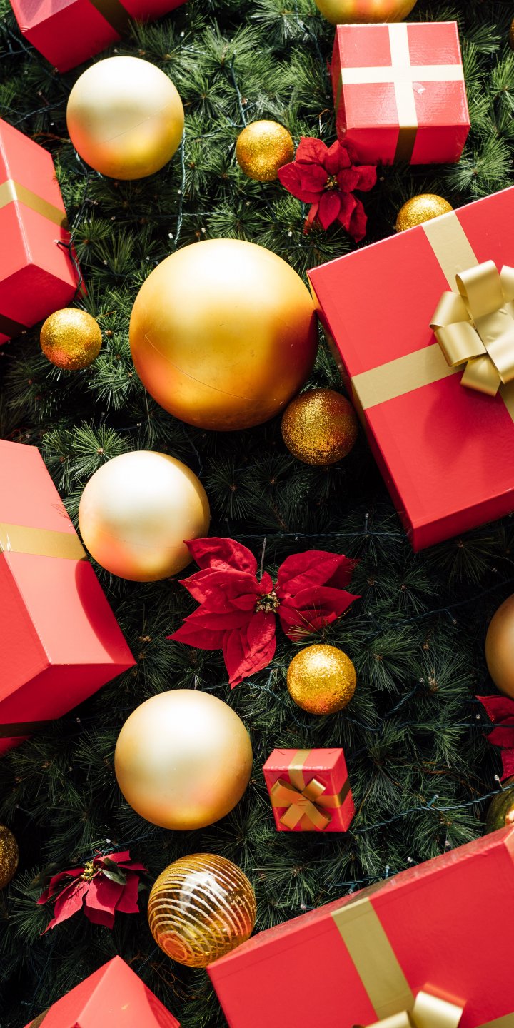 Обои: подарки, праздник, шарики, красный - 720x1440