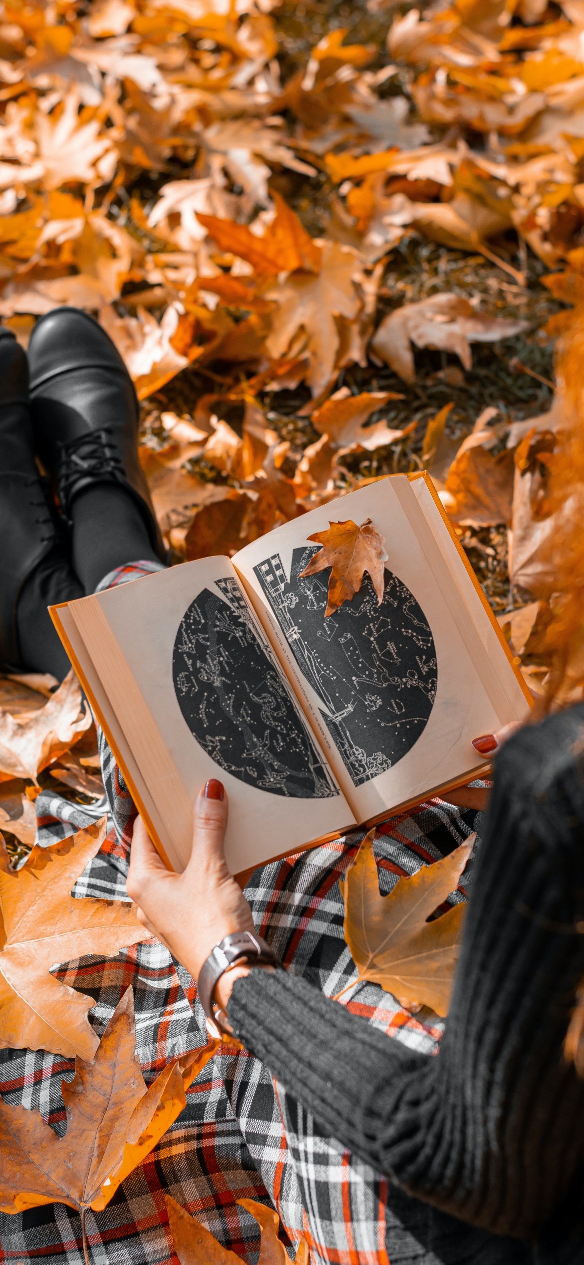 Обои: осень, девушка, кленовый лист, настроение осень, книга - 1170x2532