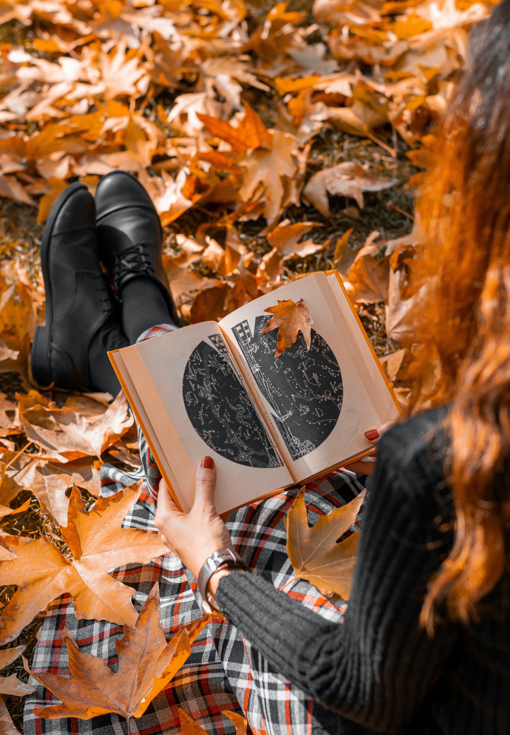 Обои: осень, девушка, кленовый лист, настроение осень, книга - 1640x2360