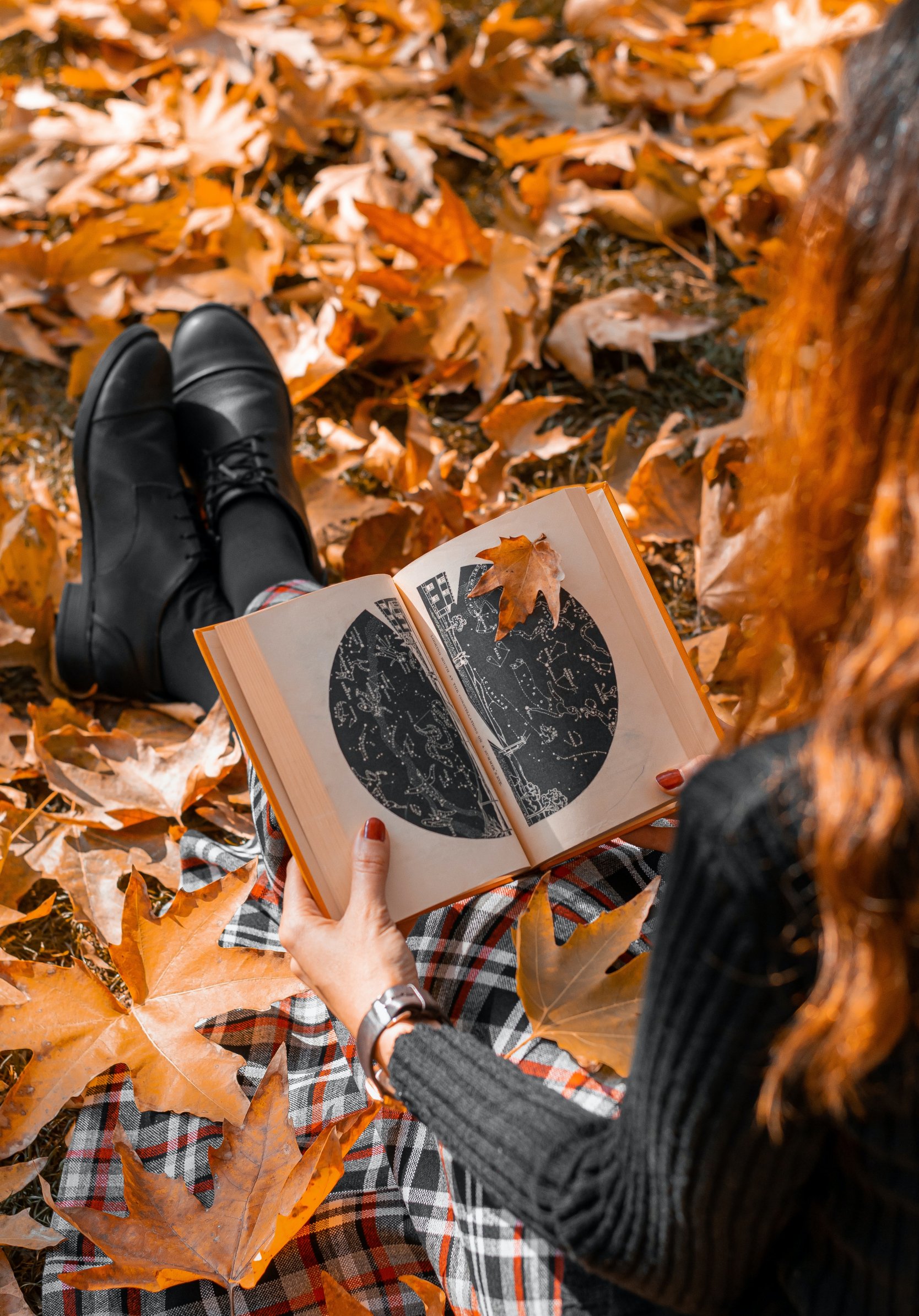 Обои: осень, девушка, кленовый лист, настроение осень, книга - 1668x2388