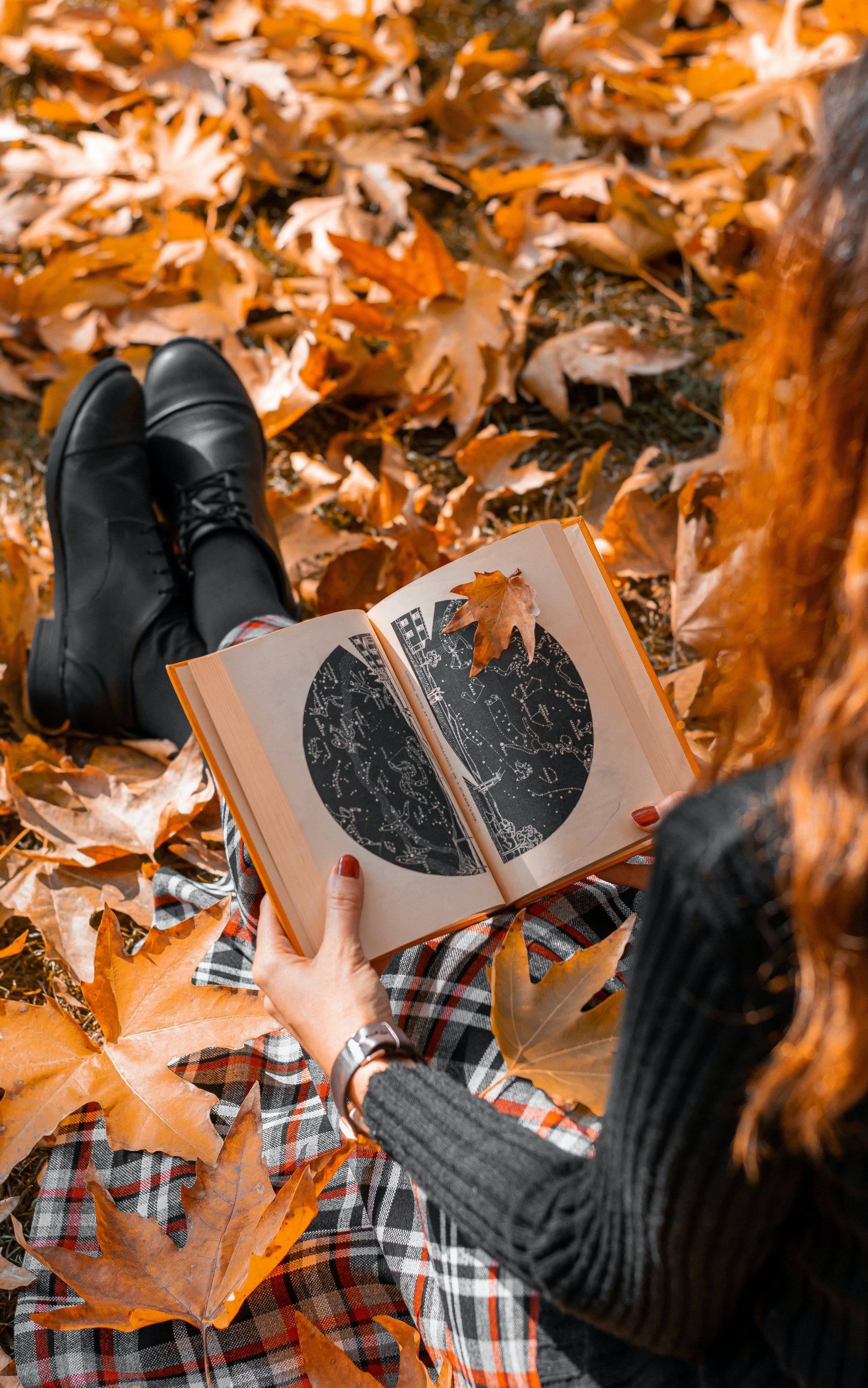Обои: осень, девушка, кленовый лист, настроение осень, книга - 1752x2800