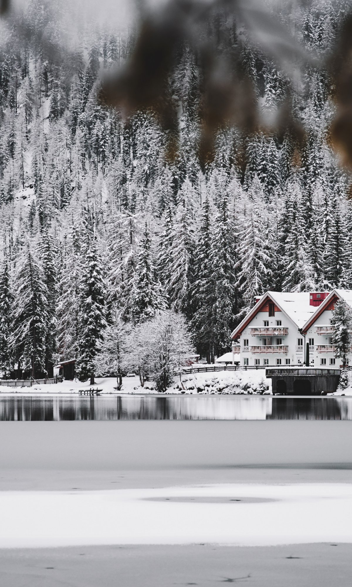 Обои: зима, снег, холод, лед, дом у озера, лес, в лесу - 1200x2000
