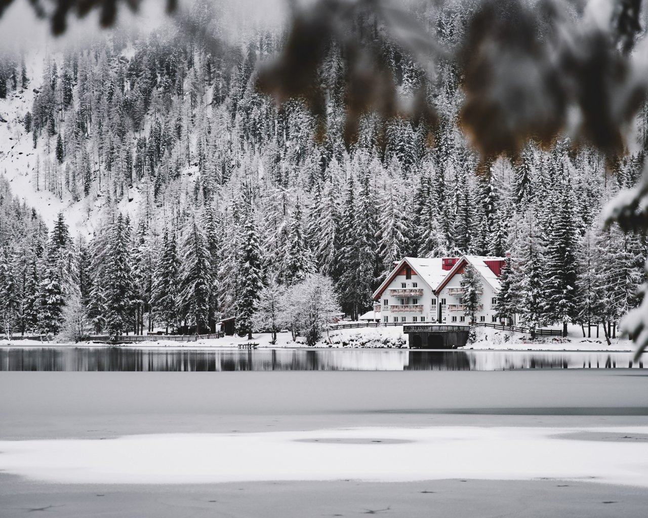 Обои: зима, снег, холод, лед, дом у озера, лес, в лесу - 1280x1024