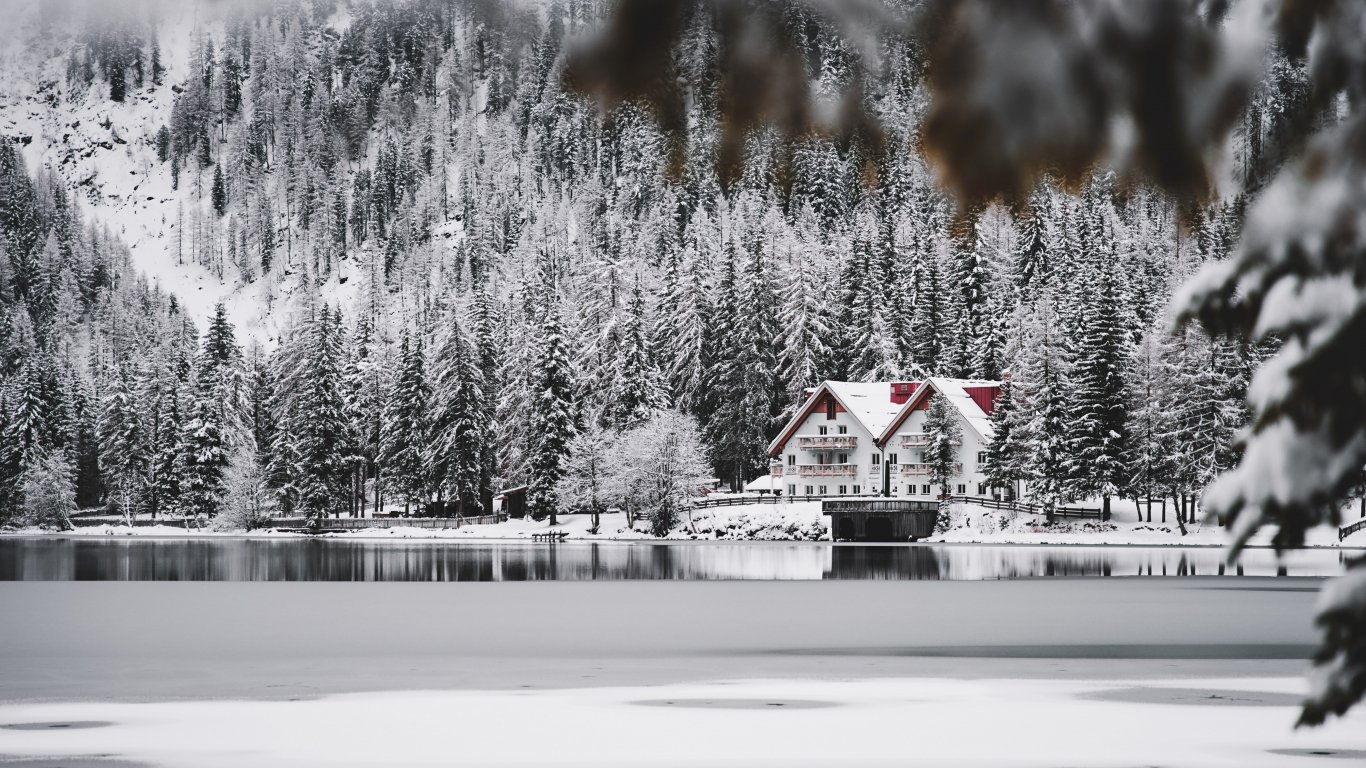 Обои: зима, снег, холод, лед, дом у озера, лес, в лесу - 1366x768